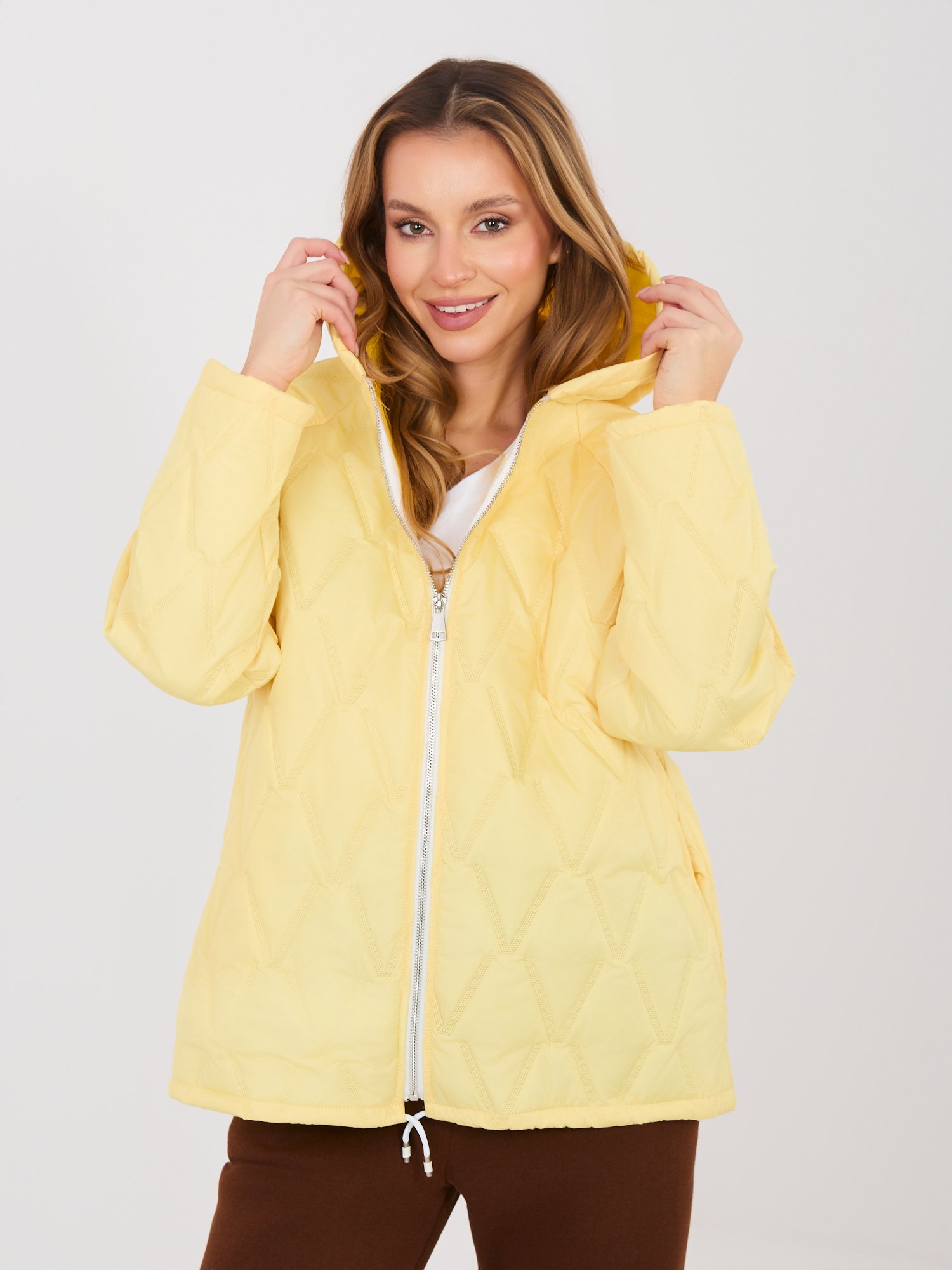 • Krūtinė – ~116 cm • Ties klubai – 120 cm • Rankovių ilgis – 69 cm • Bendras ilgis – 72 cm |