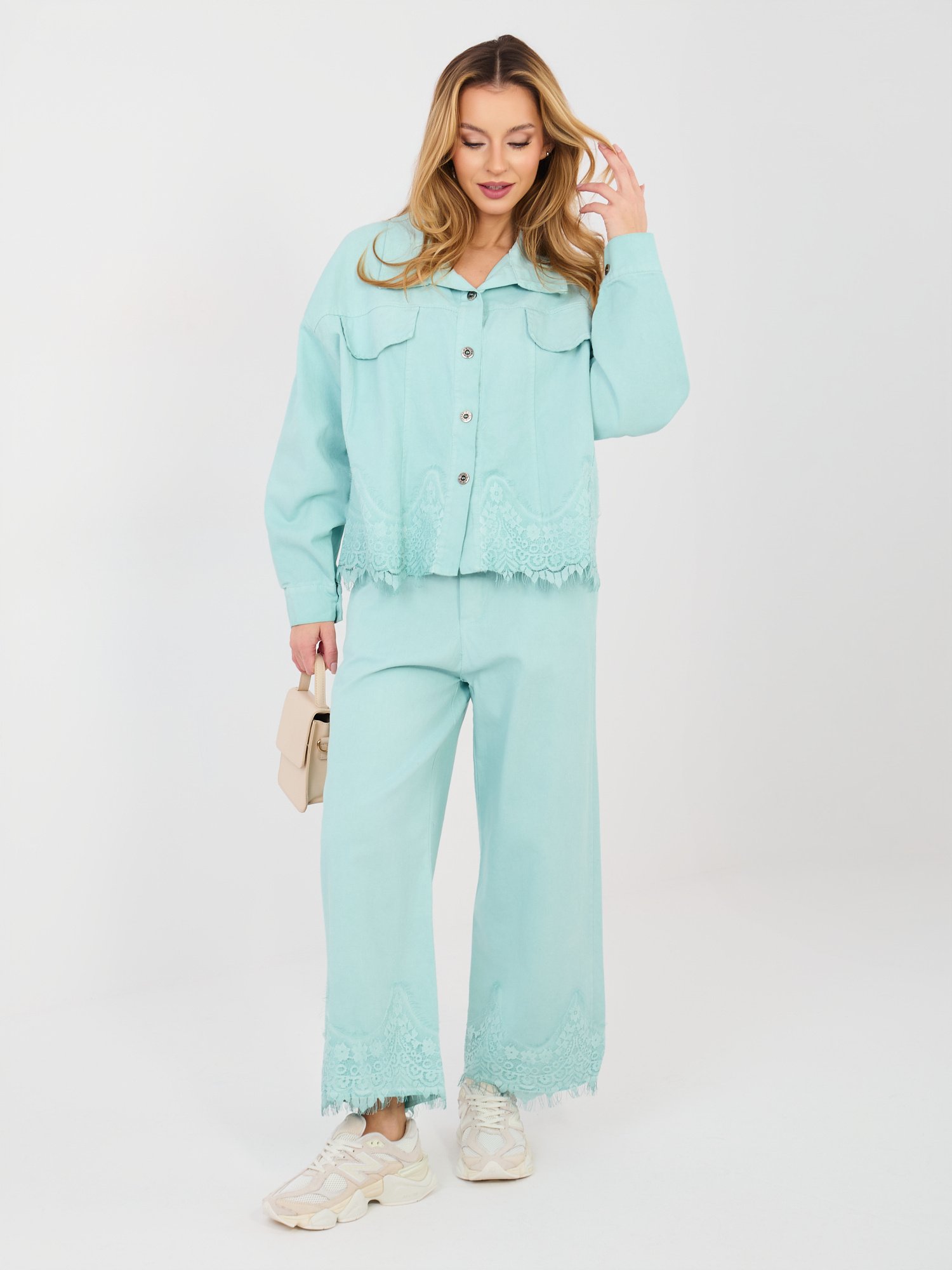• Krūtinė – ~128 cm • Klubai – 128 cm • Rankovių ilgis – 52 cm (nuo siūlės) • Bendras ilgis – 58 cm |