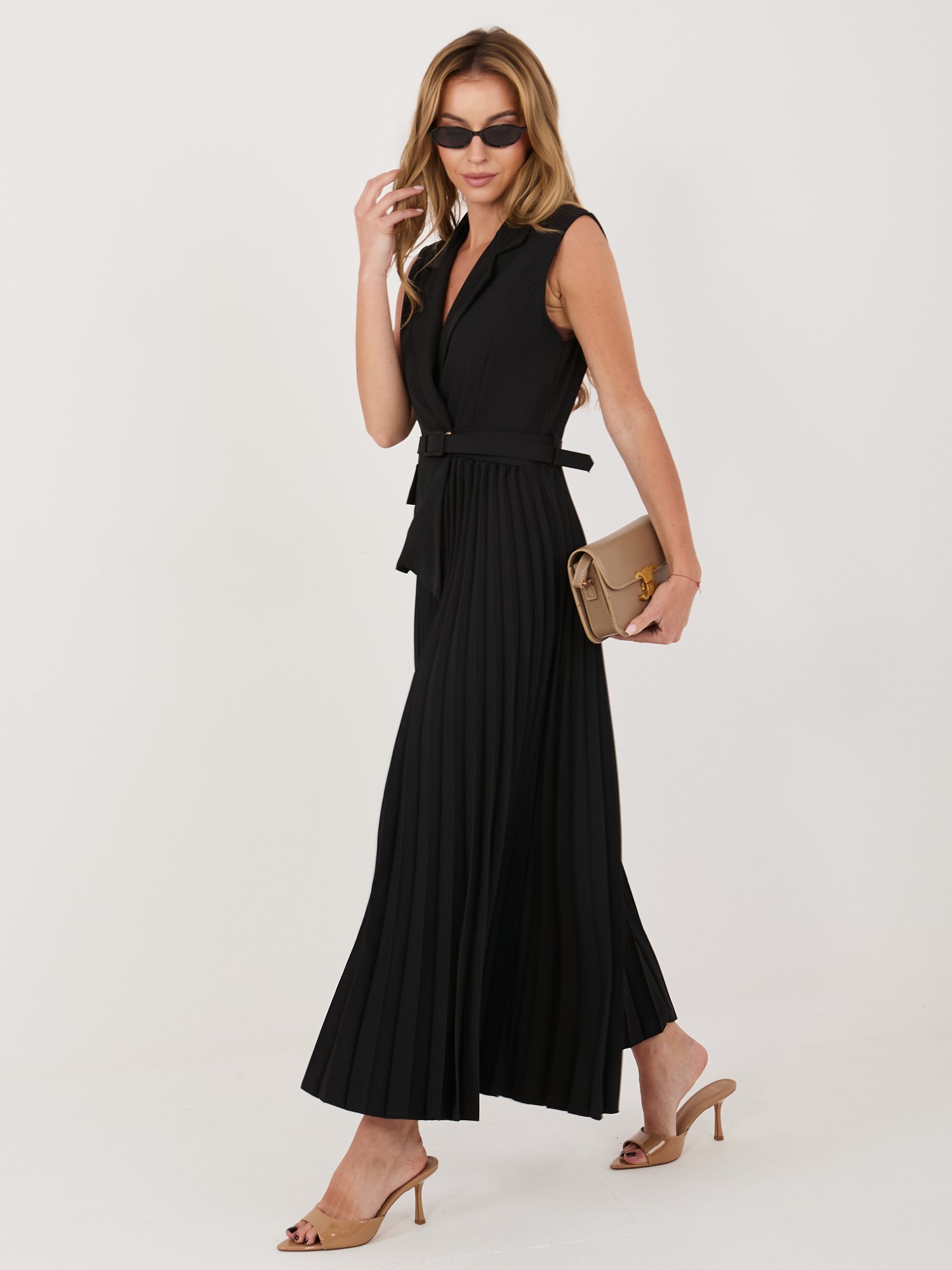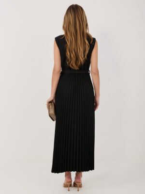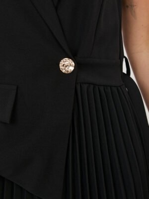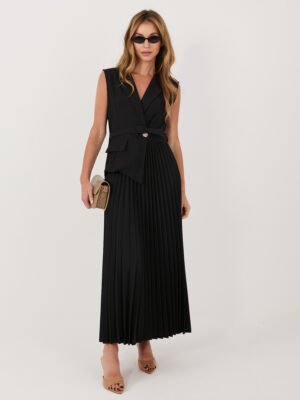 Aukštos kokybės audinio elegantiška ir stilinga  suknelė, kuri sujungia klasikinį liemenės siluetą ir moterišką plisuoto sijono lengvumą. Viršutinė dalis primena liemenę su atlapais ir subtiliai įliemenuotu kirpimu, o žemiau krentantis plisuotas sijonas suteikia judesio ir grakštumo. Suknelė papildyta nuimamu diržu, kuris išryškina liemenį ir suteikia išbaigtą įvaizdį. Tai universalus pasirinkimas tiek šventei, tiek ypatingai progai ar rafinuotam kasdieniam deriniui.