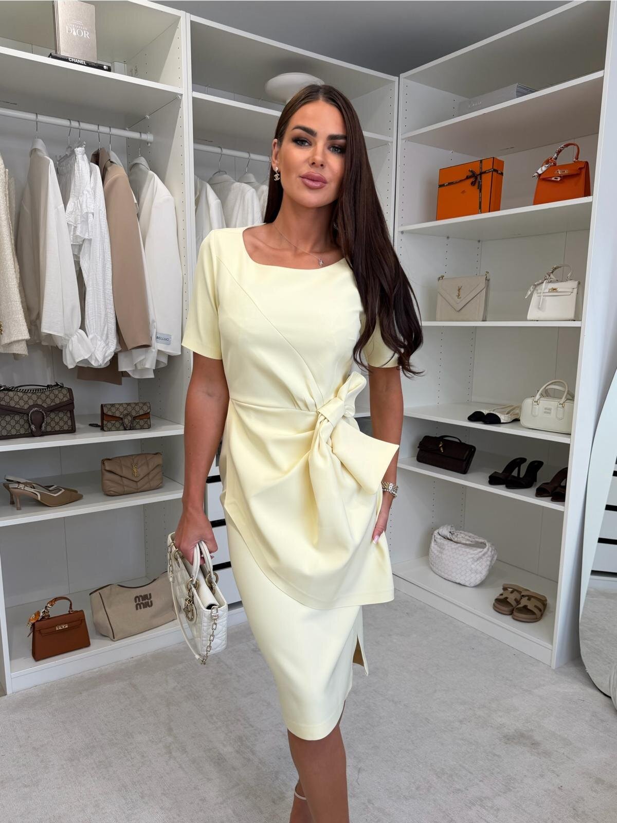 Klasikinės elegancijos suknelė su moderniu akcentu “MONIQ” šviesi geltona
