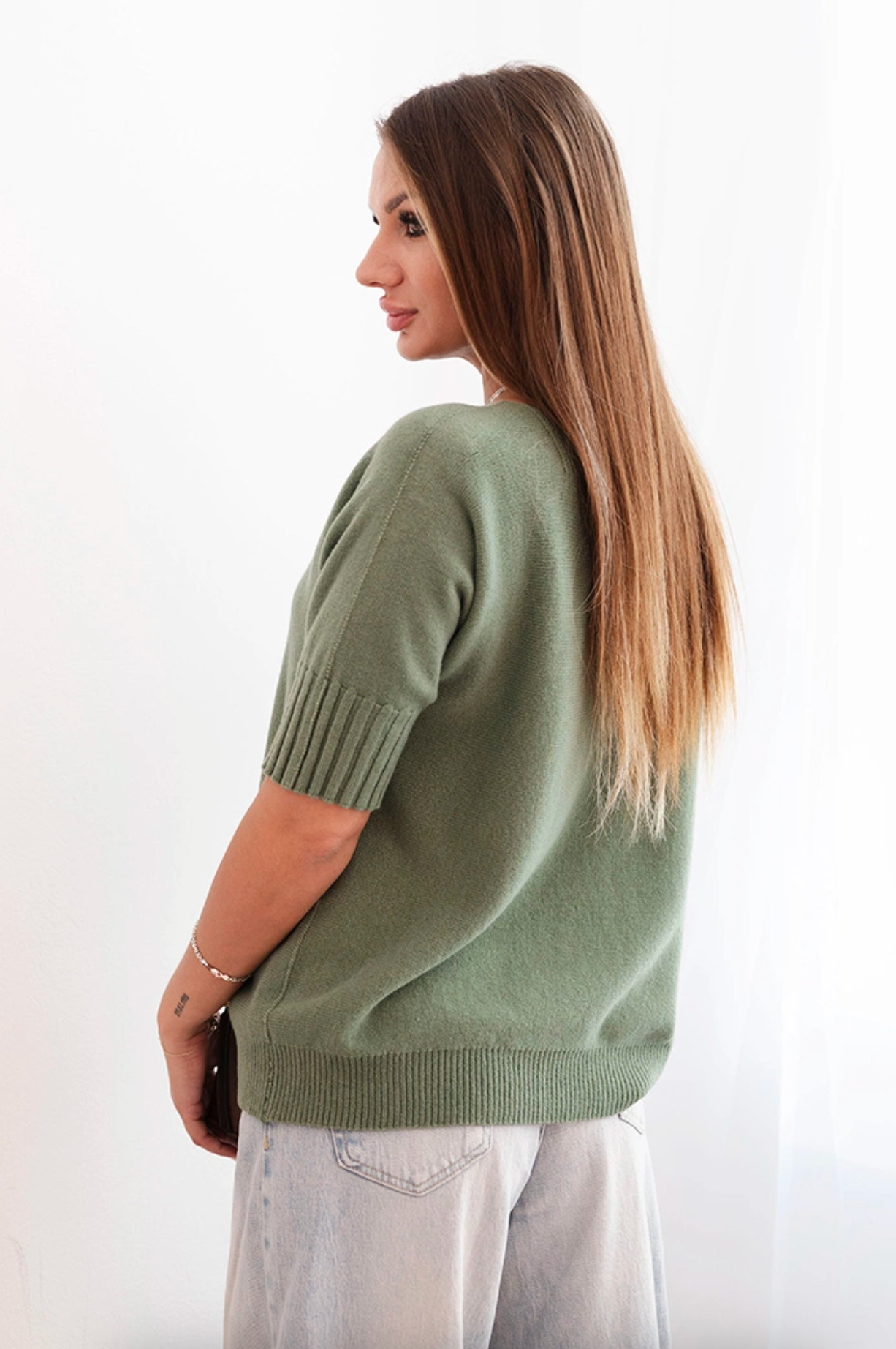 Klasikinio kirpimo viskozės megztinis trumpomis rankovėmis “Mia” Khaki