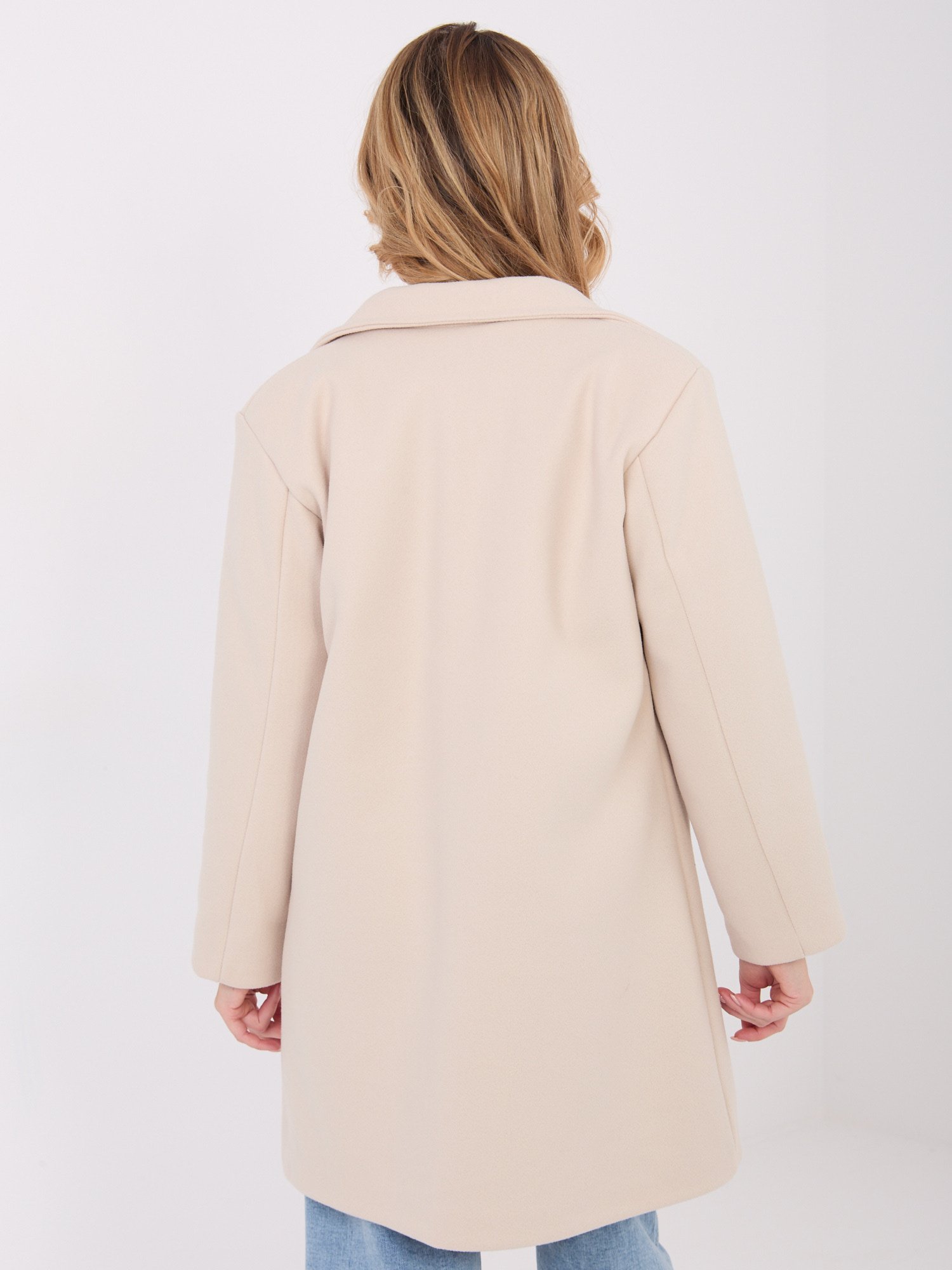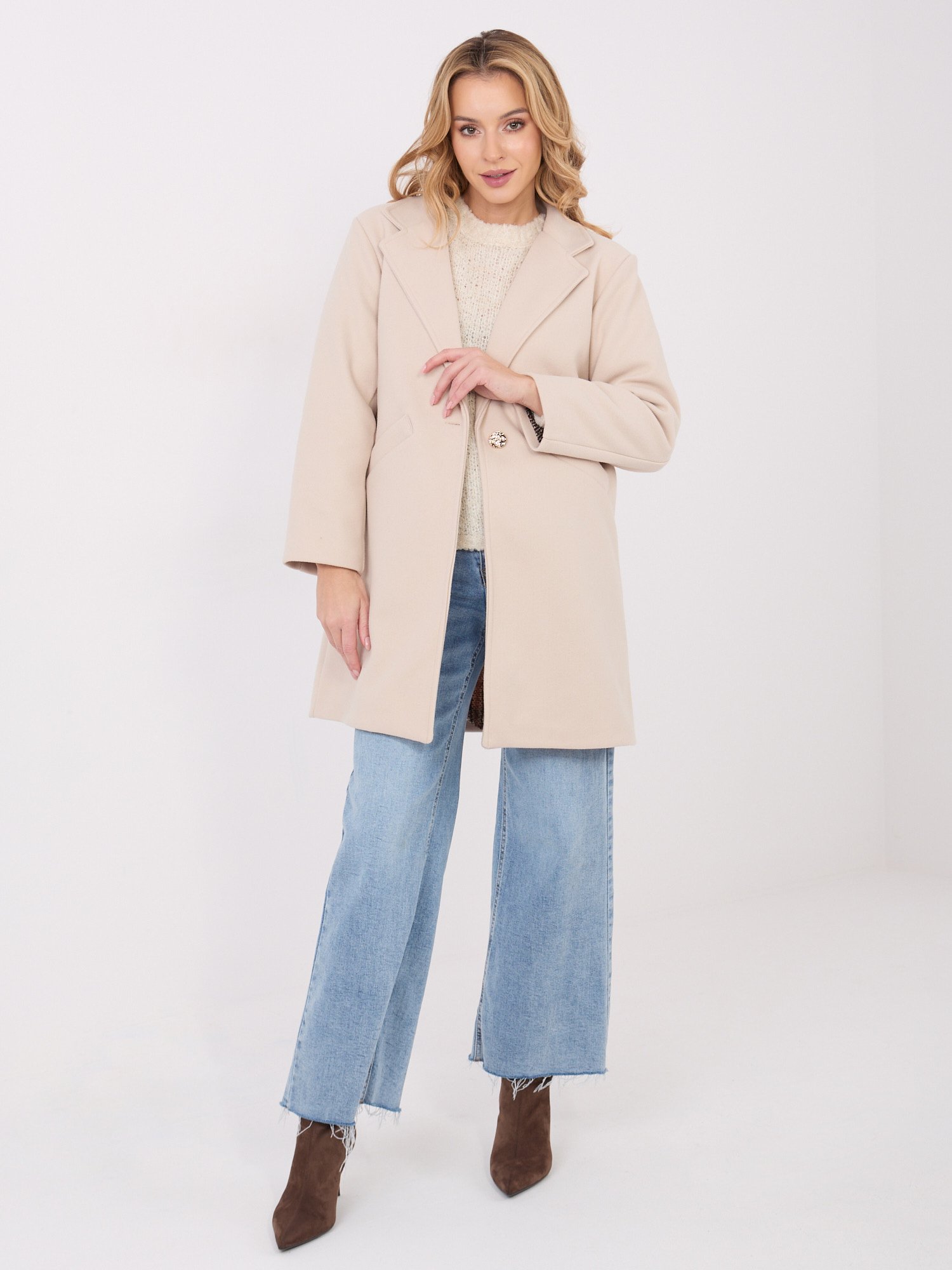 Klasikinio stiliaus trumpas paltas užsegamas dekoratyvine saga “VALERY” šviesi smėlio