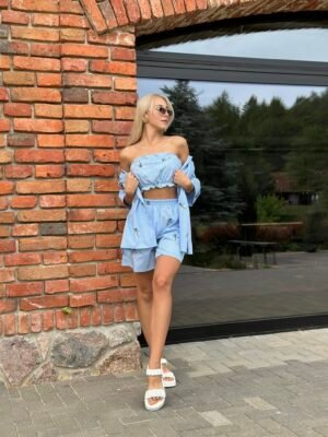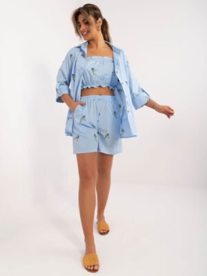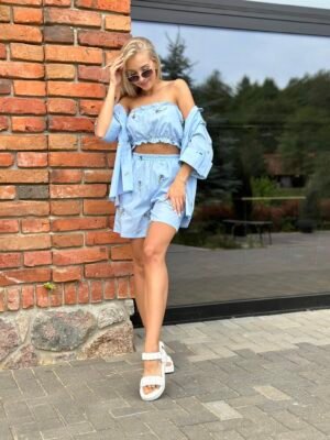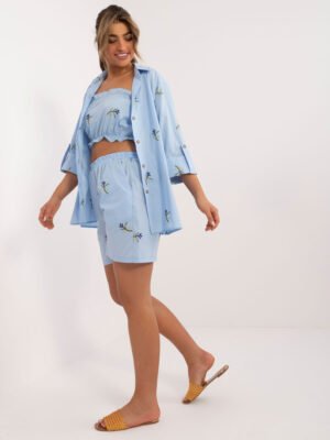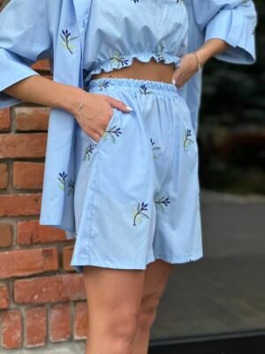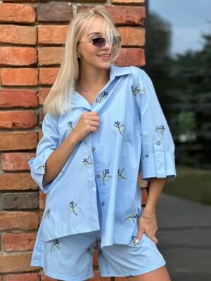 Wymiary kompletu w rozmiarze S/M mierzone na płasko: szerokość koszuli pod pachami – 45 cm, długość rękawa – 40 cm, długość koszuli – 72 cm, długość topu -22 cm, szerokość topu pod pachami – 32 cm, szerokość szortów w pasie – 46 cm, długość szortów – 95 cm.