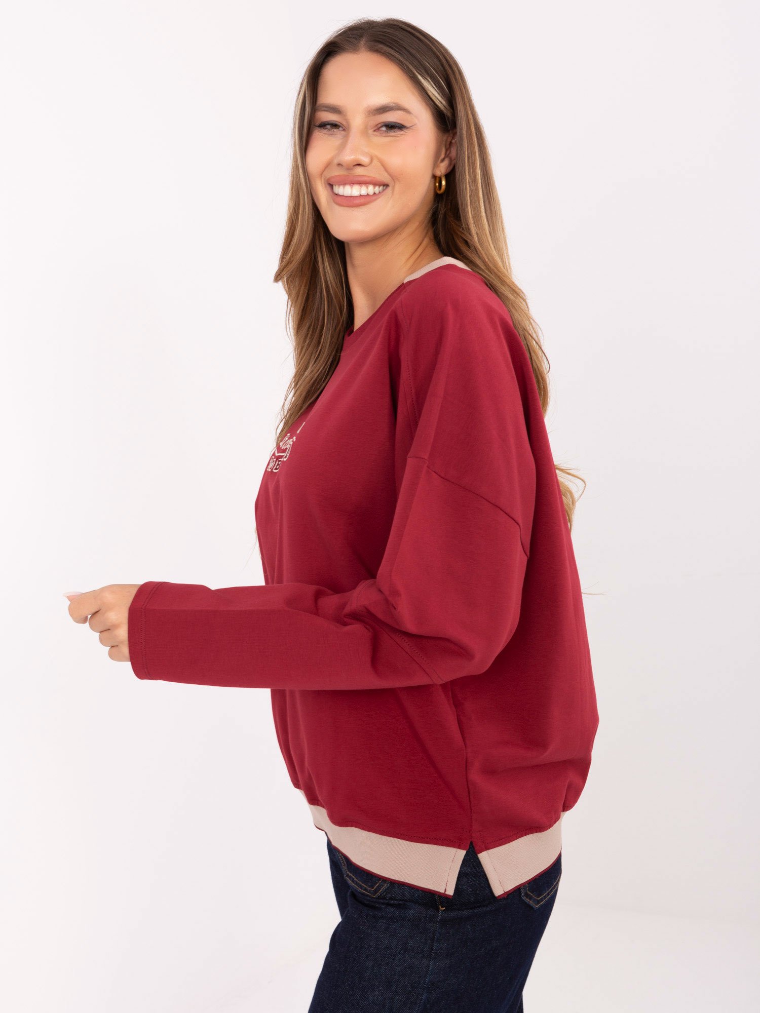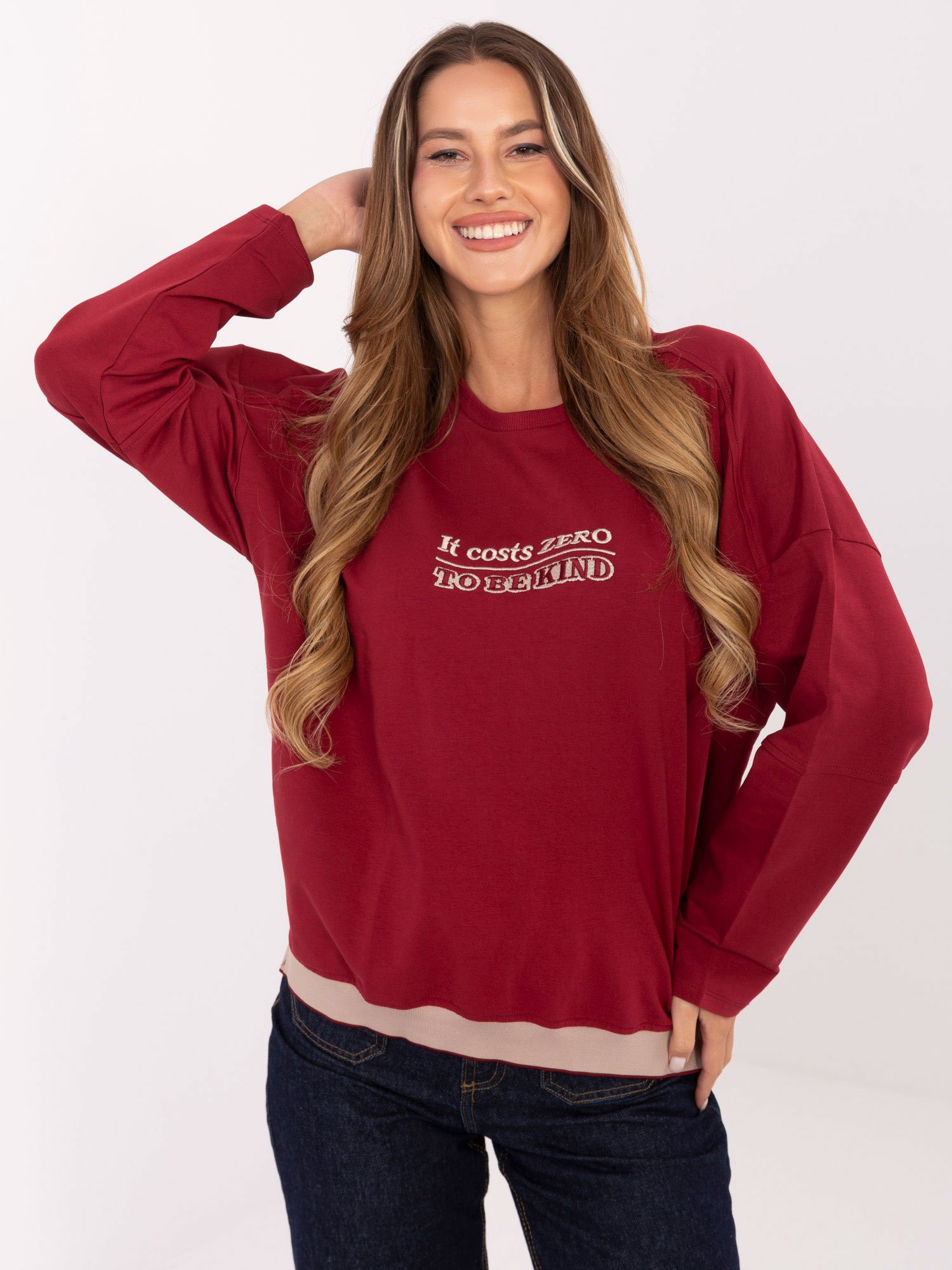 Modelis dėvi VIENO DYDŽIO (ONE SIZE) džemperį
