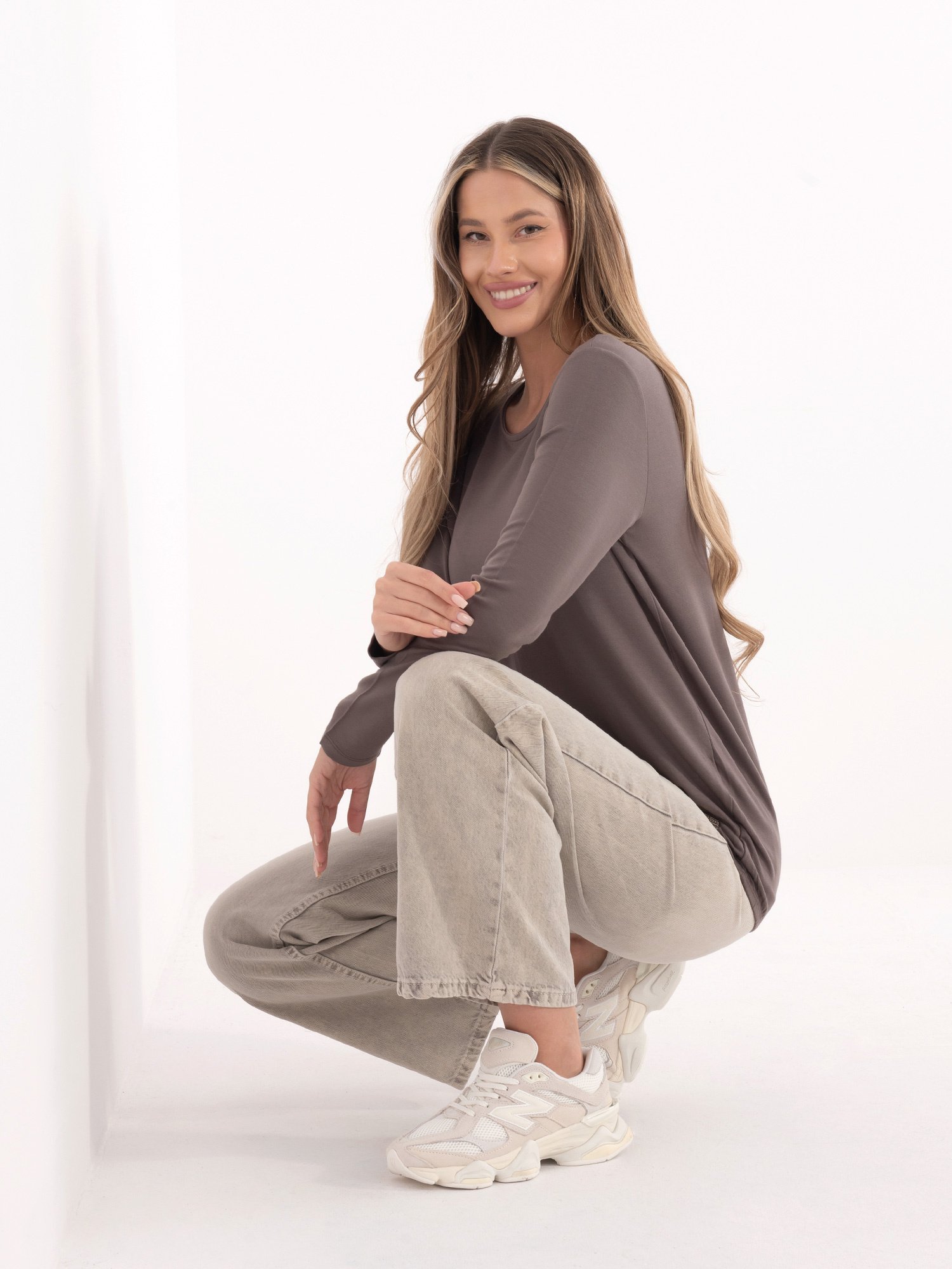Lengva, švelniai krintanti laisvalaikio palaidinė ilgomis rankovėmis ir laisvu siluetu. Laisvas kritimas leidžia palaidinei natūraliai prisitaikyti prie figūros, o minimalistinis dizainas suteikia universalumo — drabužį lengva derinti tiek prie džinsų, tiek prie klasikinių kelnių ar sijonų.