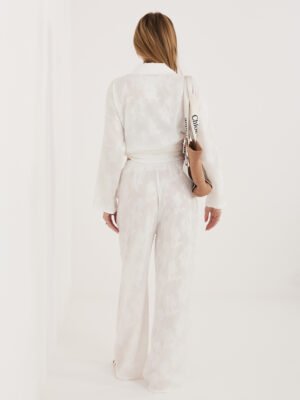 Lengvas dviejų dalių komplektas– stilingas ir patogus pasirinkimas šiltajam sezonui. Komplektą sudaro laisvo silueto marškiniai ir plačios, nevaržančios judesių kelnės,  Subtilus raštas suteikia išskirtinumo ir lengvos elegancijos. Kostiumą galima dėvėti kartu arba derinti atskirai – kuriant tiek kasdienius, tiek atostogų įvaizdžius.