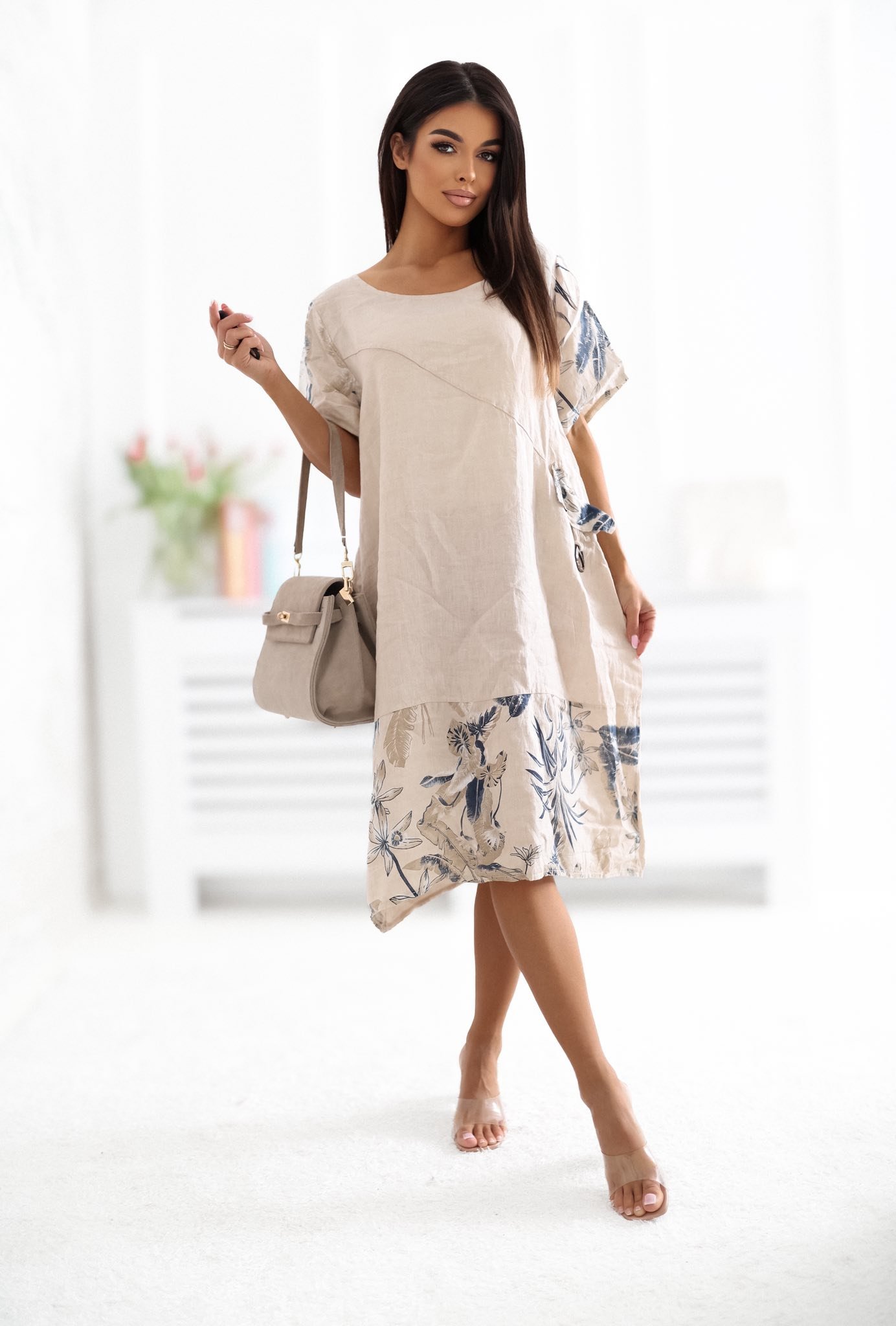 Modelis dėvi VIENO DYDŽIO suknelę.