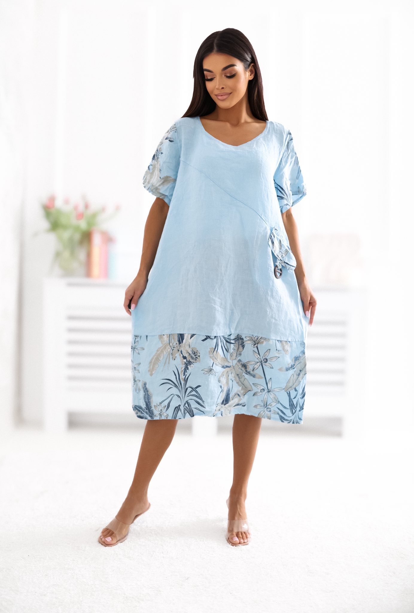 Lininio audinio suknelė su gėlių intarpaius “SILVIA” šviesi mėlyna