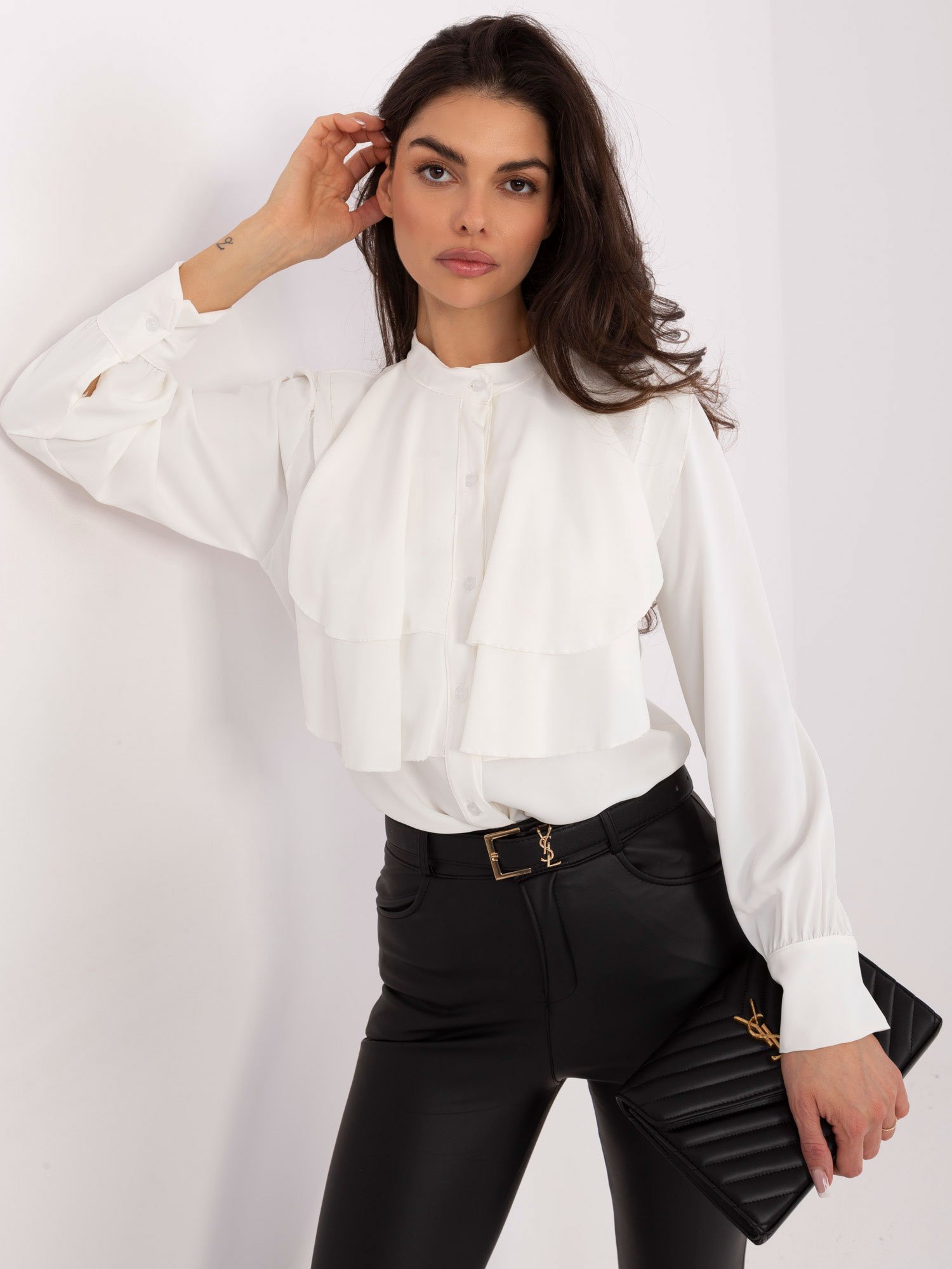Elegantiški moteriški marškiniai, išsiskiriantys subtiliomis dekoratyvinėmis klostėmis priekyje, kurios suteikia išskirtinio moteriškumo ir lengvumo. Pagaminta iš minkštos, lengvos ir formą išlaikančios medžiagos, kuri maloniai priglunda prie kūno ir leidžia jaustis patogiai visą dieną. Universalus modelis, kuris išlaiko balansą tarp klasikinės elegancijos ir šiuolaikinio stiliaus – nepakeičiamas pasirinkimas kiekvienos moters garderobe.