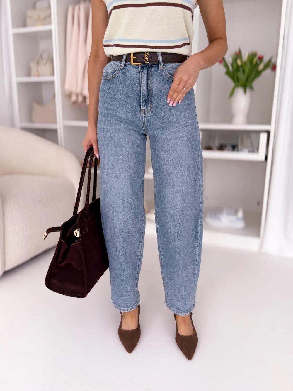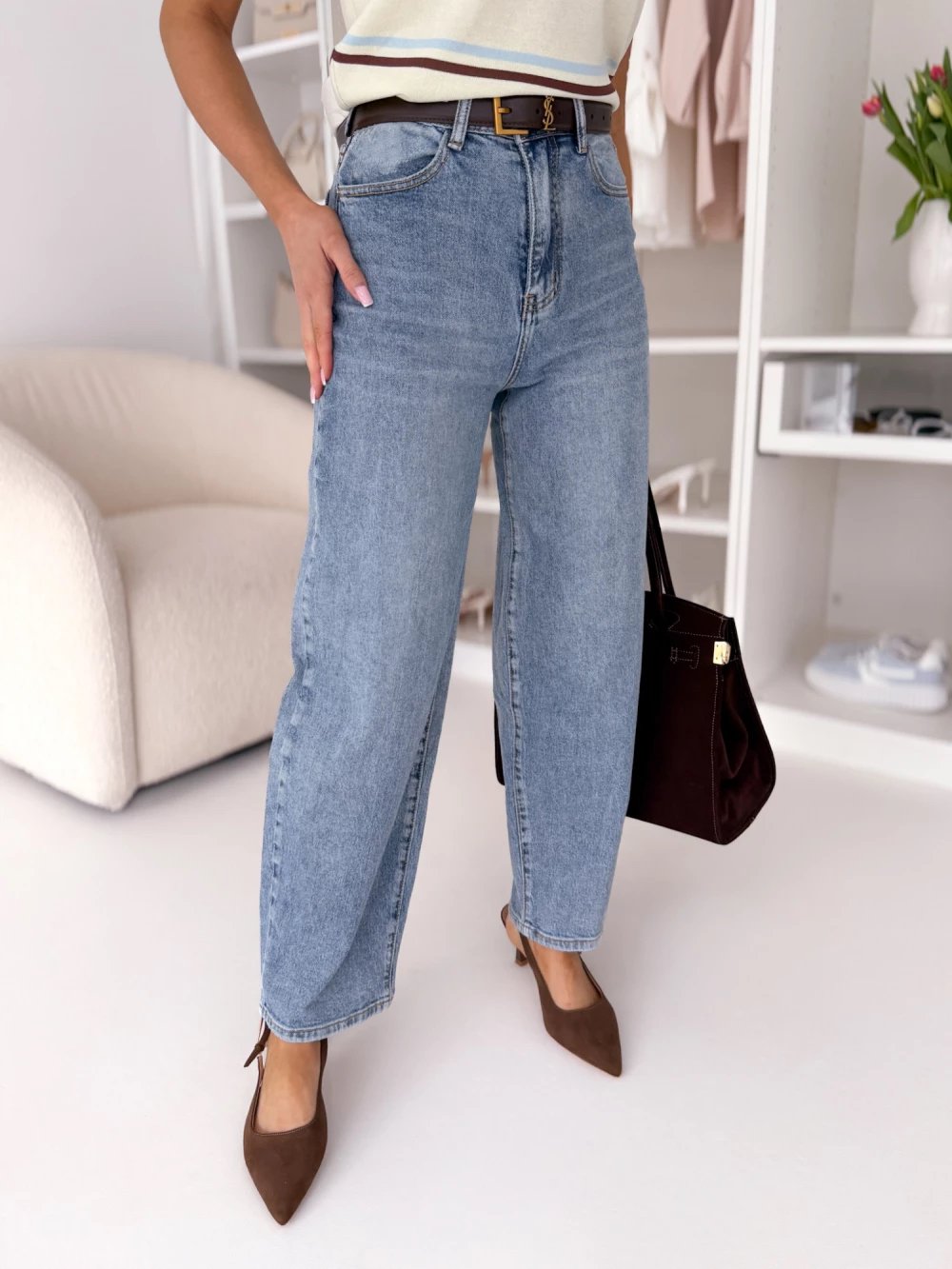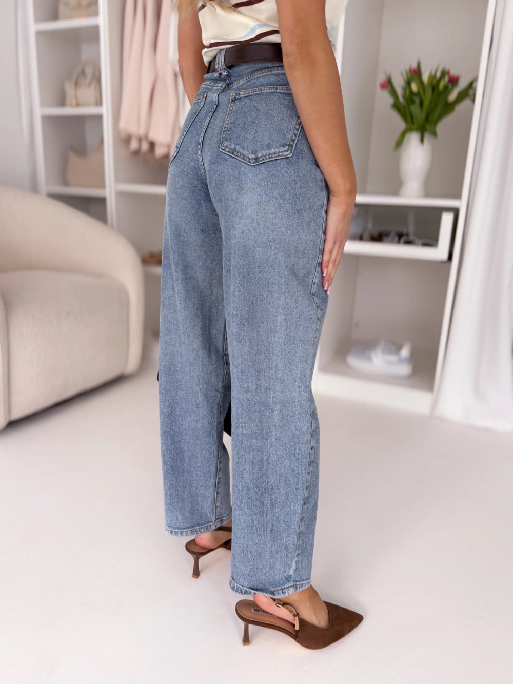 Modelis dėvi S dydžio džinsus.