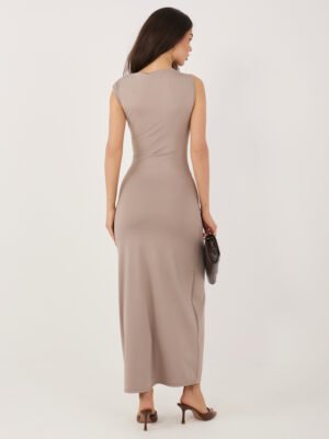 Midi ilgio suknelė su drapiruotu liemeniu ir dekoratyvine sagtimi “MAORY” tamsi smėlio