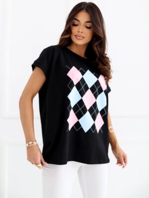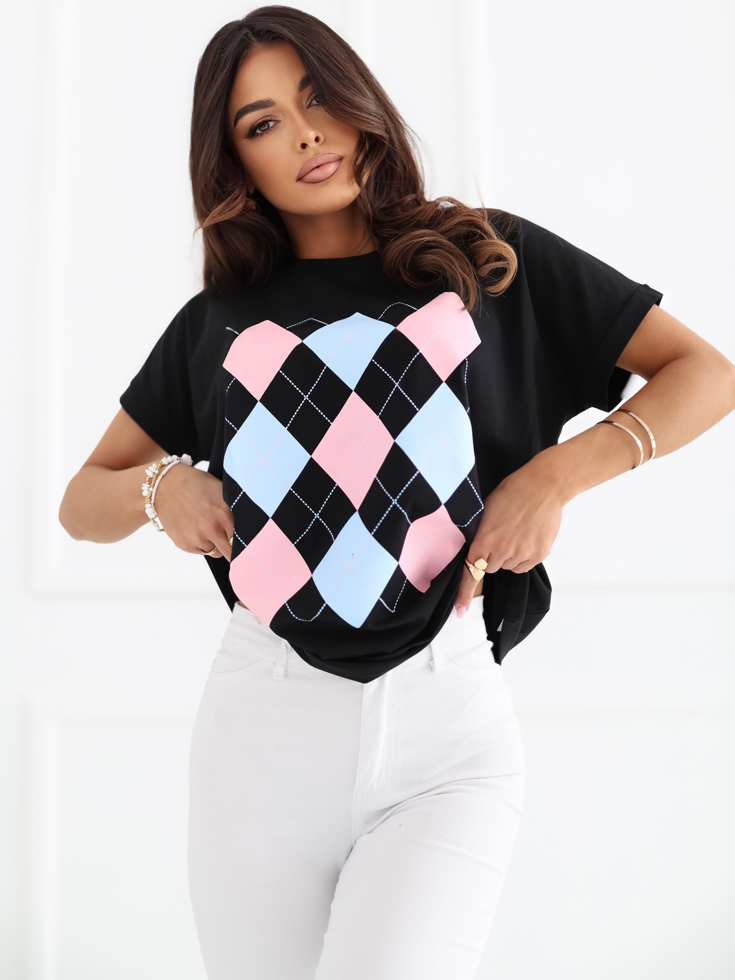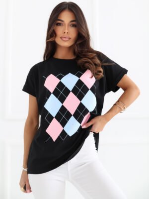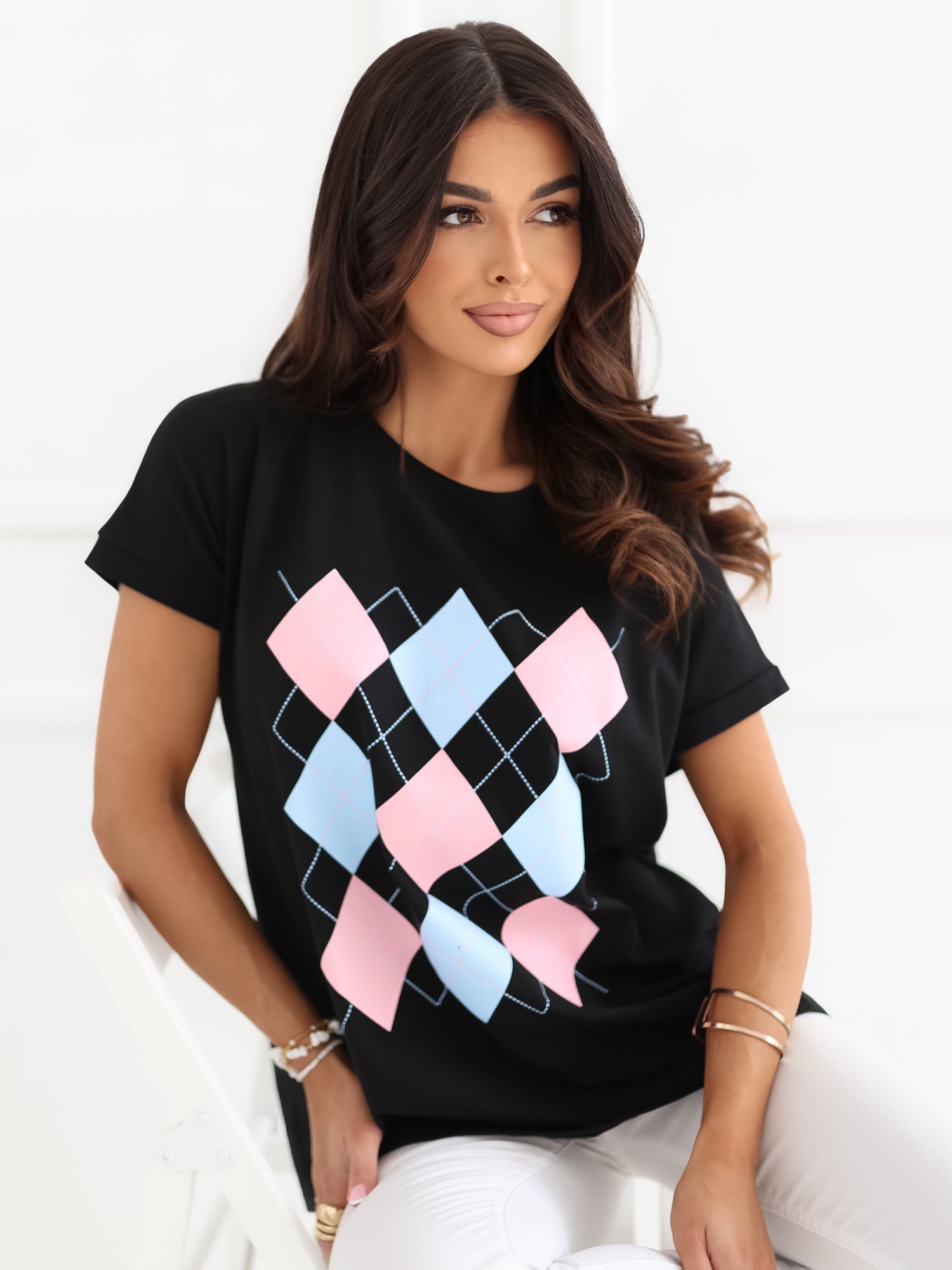 Minimalistiniai marškinėliai su klasikiniu rombų raštu “SELEN” juoda