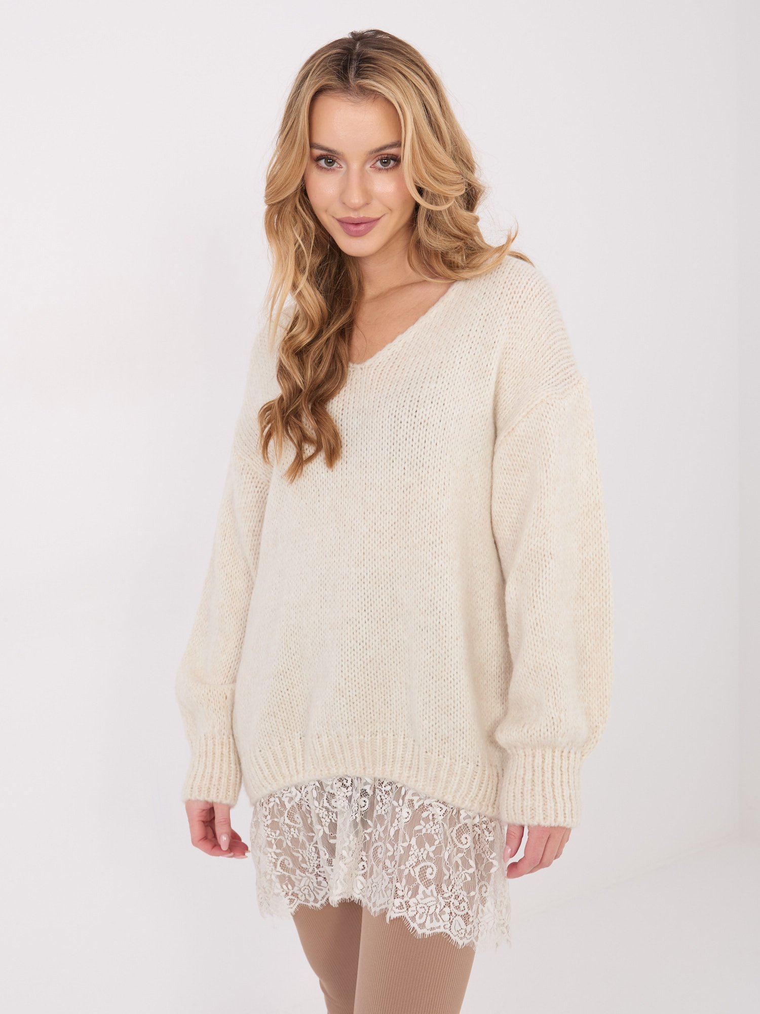 Modelis dėvi VIENO DYDŽIO (one size) megztinį.