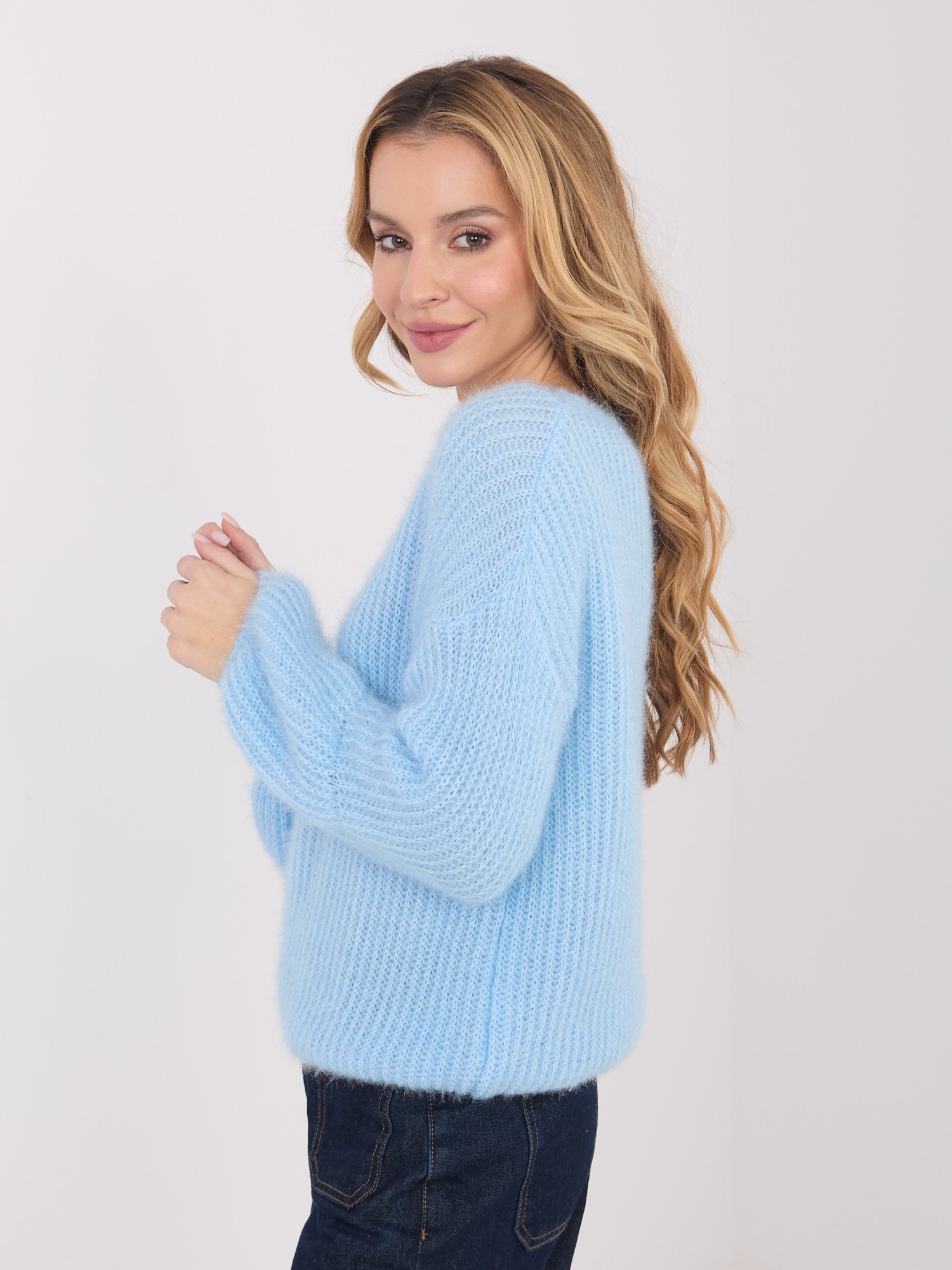 Modelis dėvi VIENO DYDŽIO (one size) megztinį.