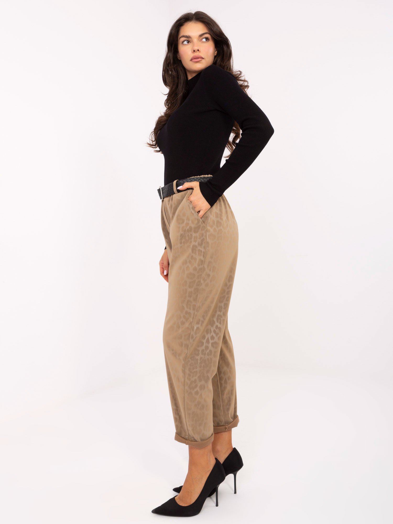 Stilingos odos imitacijos kelnės su subtiliu tekstūriniu raštu – išskirtinis pasirinkimas drąsesniam ir madingam įvaizdžiui. Aukštesnio liemens modelis dailiai pabrėžia figūrą, o elastinga juosmens dalis užtikrina patogumą .Diržas suteikia papildomo akcento ir leidžia lengvai pritaikyti kelnes pagal savo stilių. Šios kelnės puikiai dera tiek su prigludusiomis palaidinėmis, tiek su laisvesniais megztiniais – idealus pasirinkimas tiek kasdienai, tiek vakarui.