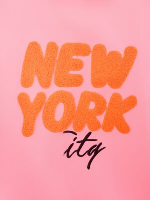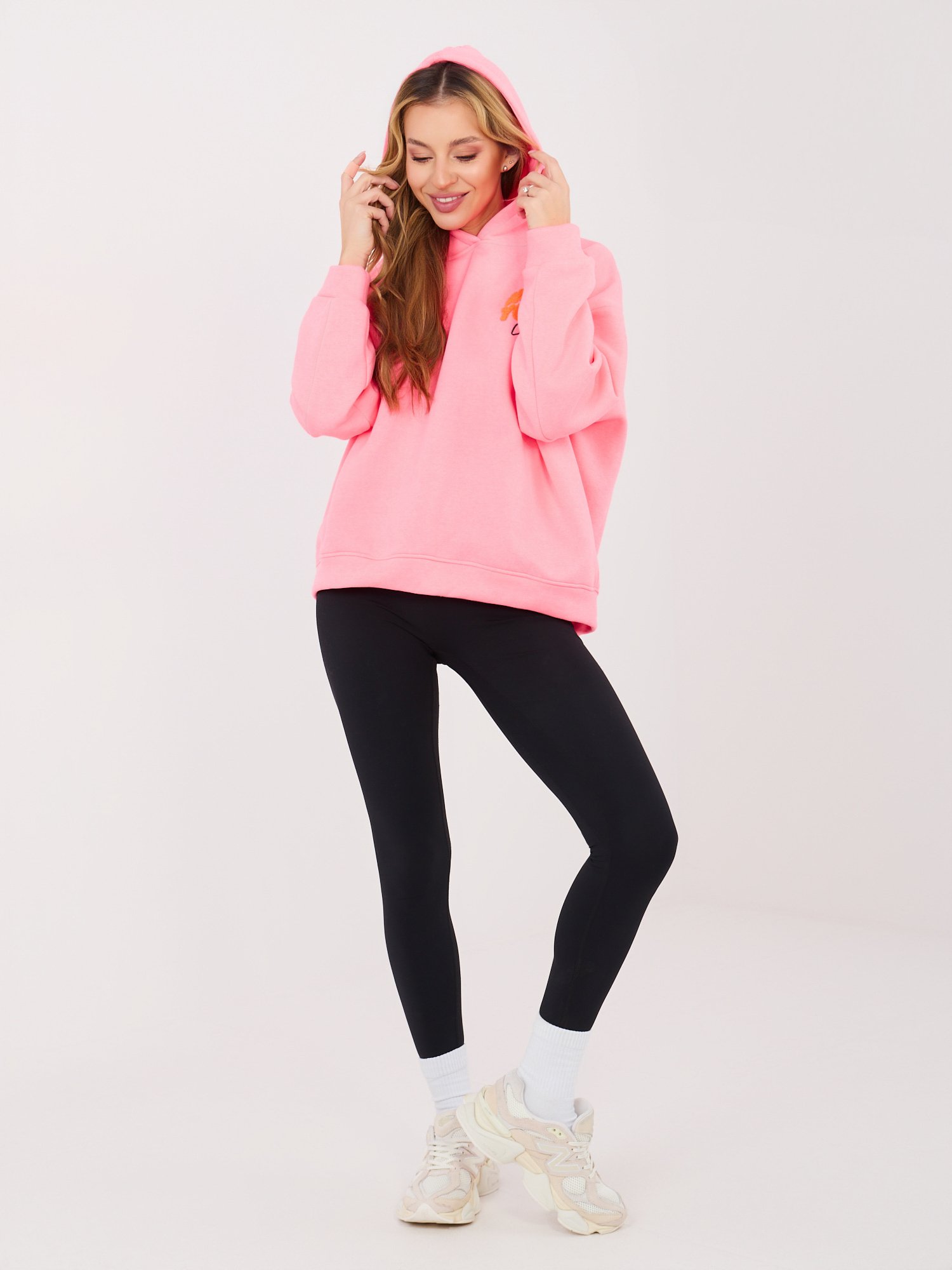 Oversize džemperis su reljefiniu užrašu ir gobtuvu “NORMA” fluo rožinė