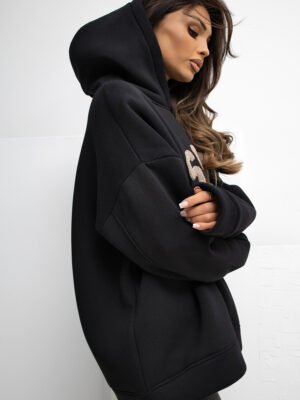 Laisvo kirpimo oversize džemperis su dekoratyviniu užrašu , plačiomis rankovėmis ir gobtuvu. Patogus, minkštas ir lengvai derinamas kasdieniam įvaizdžiui  su džinsais, tamprėmis ar sportinio stiliaus kelnėmis.