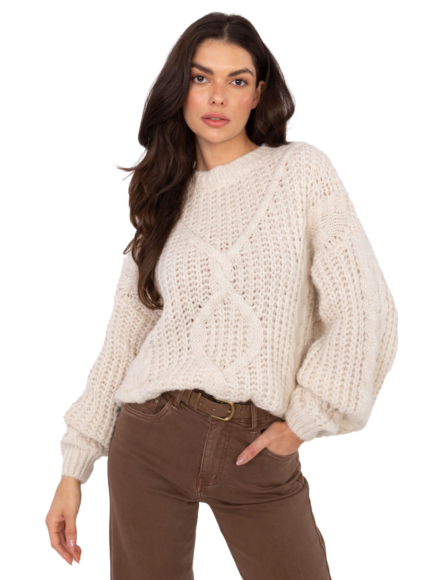 Modelis dėvi VIENO DYDŽIO (one size) megztinį.
