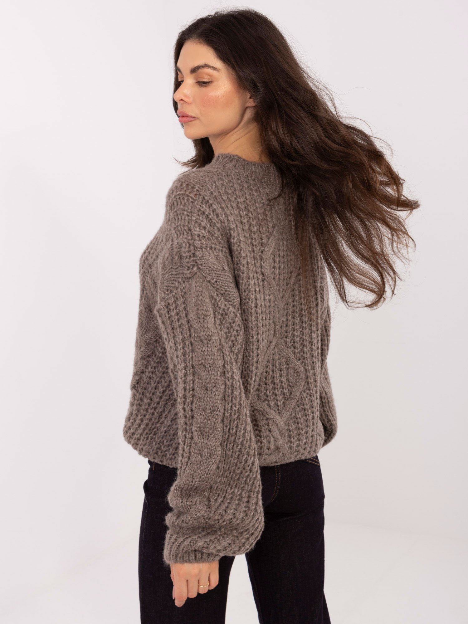 Modelis dėvi VIENO DYDŽIO (one size) megztinį.