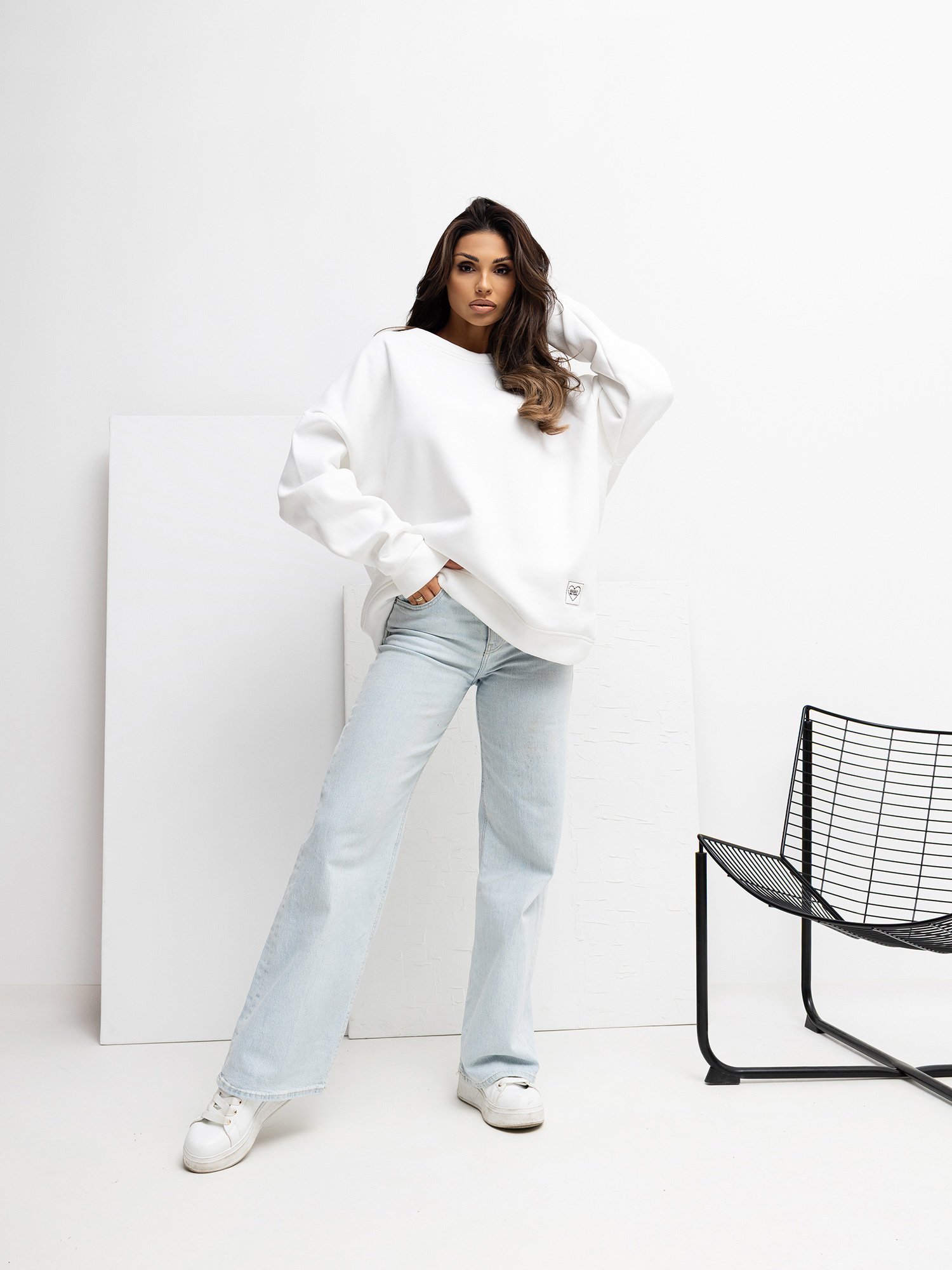 Modelis dėvi VIENO DYDŽIO (OVERSIZE) džemperį