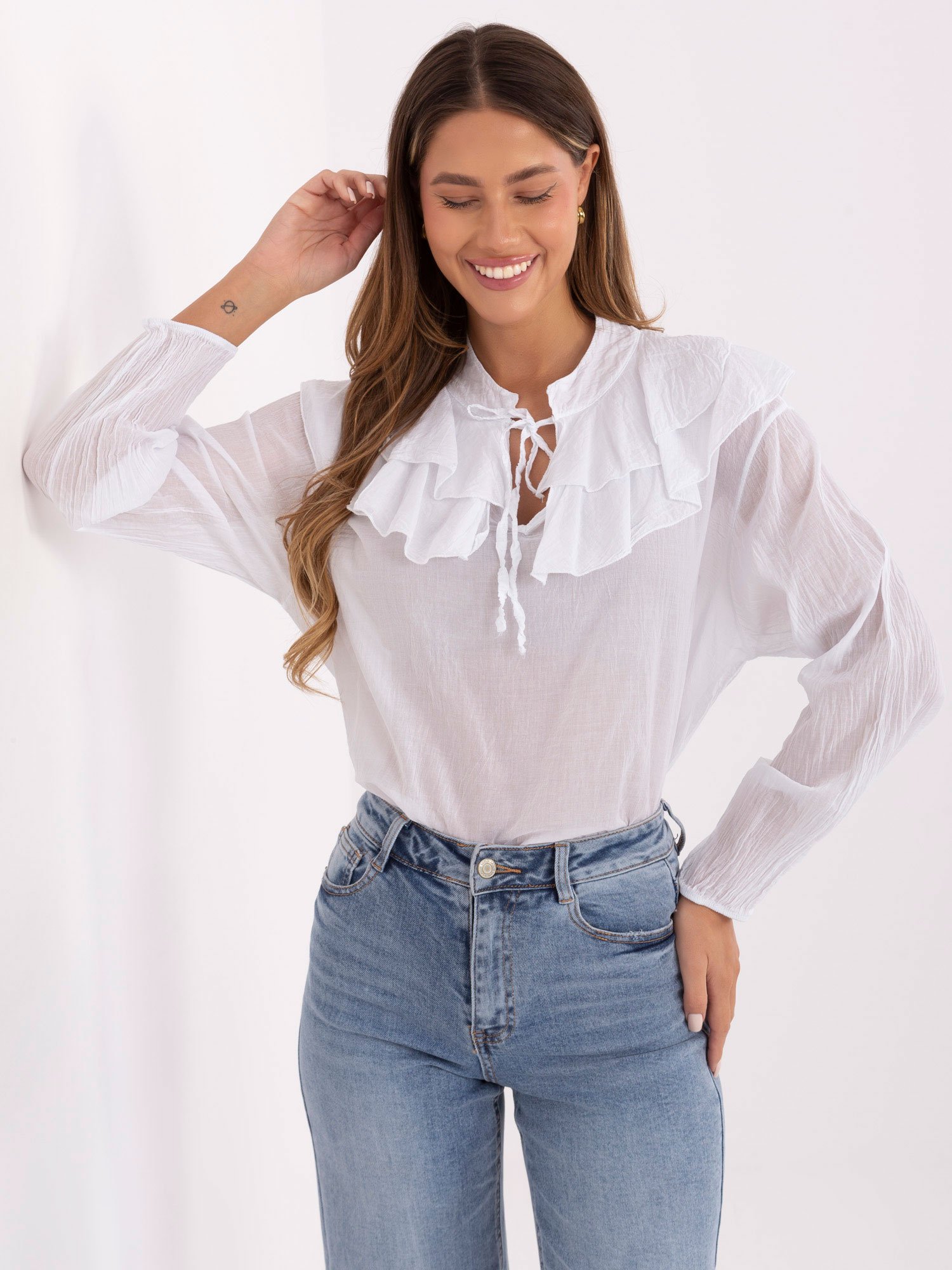 Palaidinė su dvigubais raukiniais prie kaklo ir raišteliu “LINO” balta