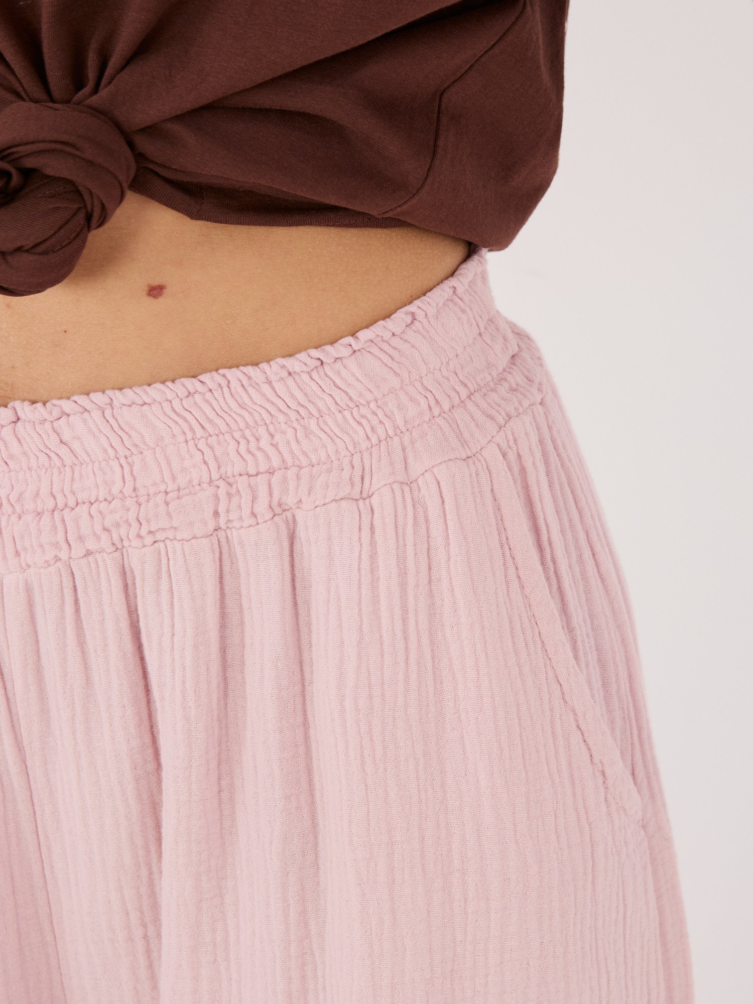 Lengvos, plačios palazzo stiliaus kelnės, sukurtos maksimaliai patogiam ir laisvam judesiui. Muslino audinys suteikia natūralumo ir leidžia odai kvėpuoti, o laisvai krintantis siluetas kuria elegantišką, tačiau neįpareigojantį įvaizdį. Lengvai derinamos tiek su kasdieniais, tiek su išraiškingesniais deriniais.