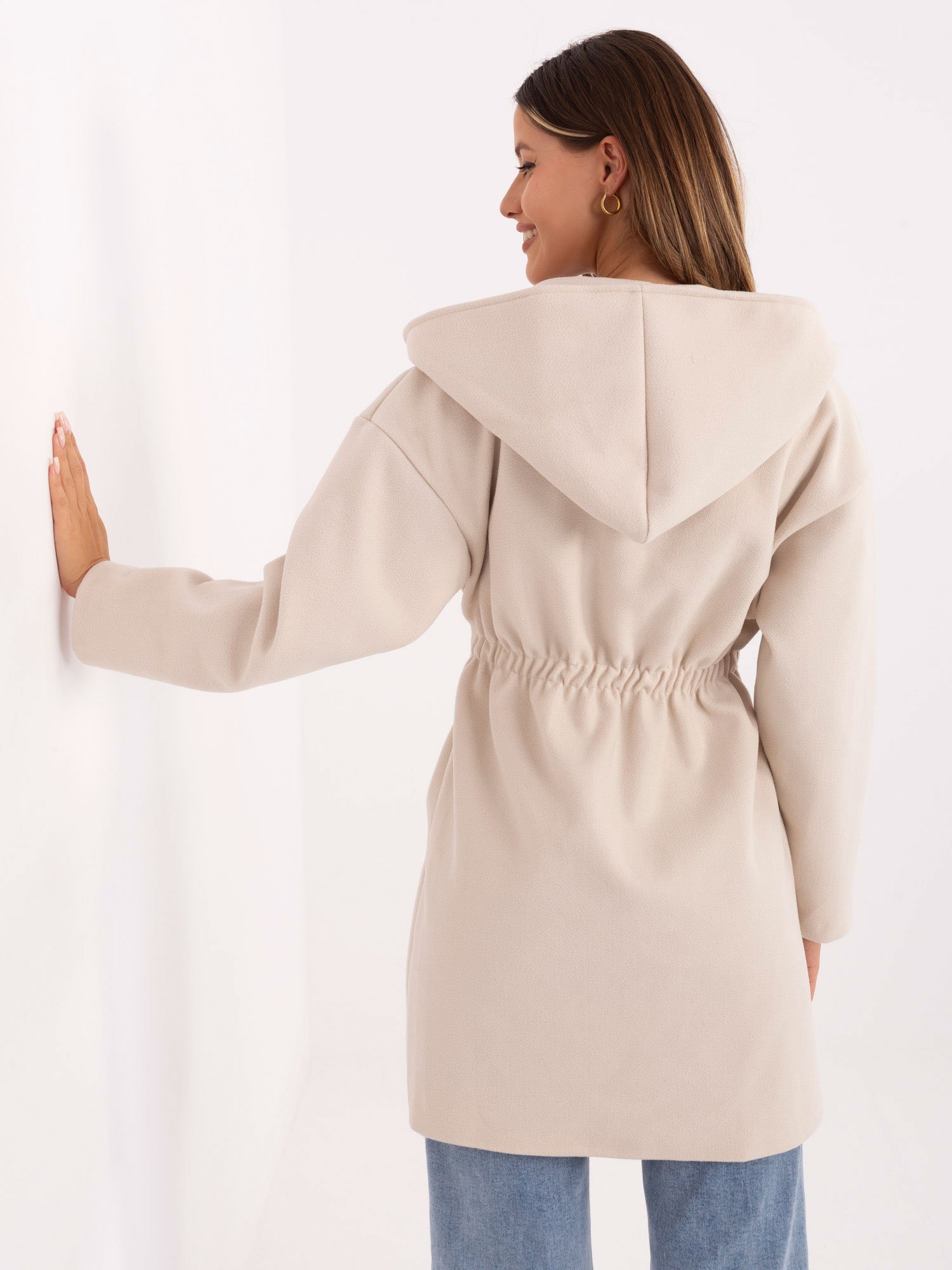 Kokybiškas, stilingas, vieno dydžio paltas su gobtuvu ir diržu.