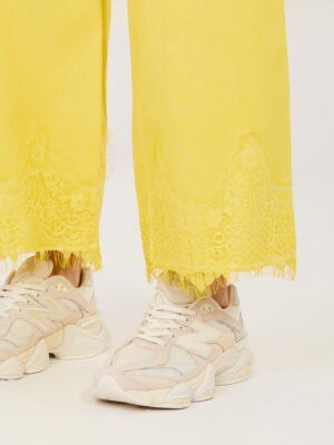 Plačios džinsinės kelnės su nėrinių apdaila “CORDY” geltona