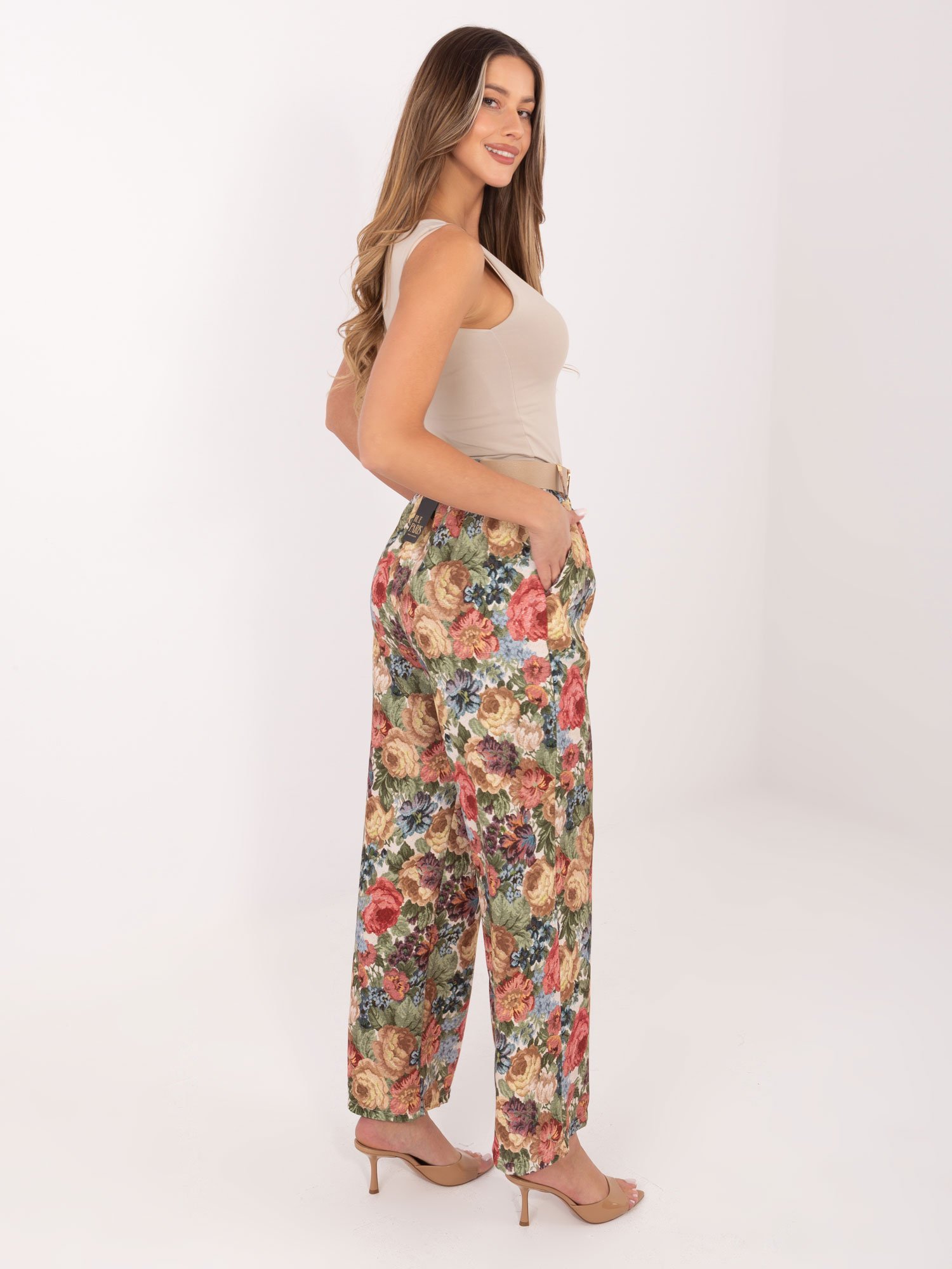 Šios plačios gėlėtos kelnės  aukštu liemeniu sukurtos patogiam ir elegantiškam įvaizdžiui. Laisvas kirpimas leidžia judėti nevaržomai, o krentantis siluetas subtiliai pabrėžia figūrą. Aukštas liemuo su diržu padeda išryškinti taliją ir suteikia papildomo universalumo kuriant skirtingus derinius.  Kelnės puikiai tinka tiek kasdieniam dėvėjimui, tiek progoms, kai norisi atrodyti tvarkingai be didelių pastangų. Taip pat galima derinti su tos pačios linijos švarku ir sukurti išbaigtą  bei madingą derinį.