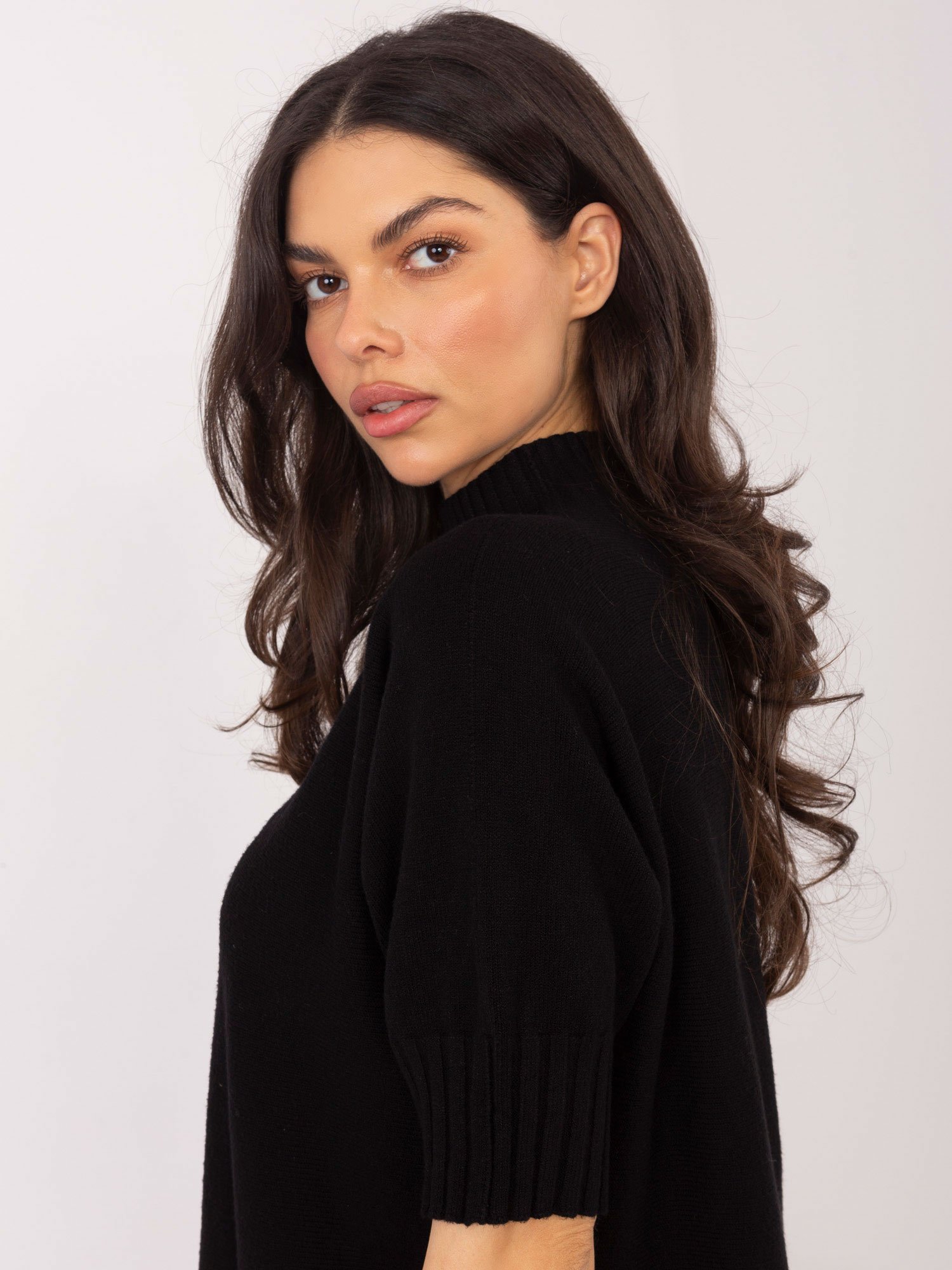 Šis megztinis su vilna  yra puikus pasirinkimas toms, kurios nori lengvo, plono, bet šilto drabužio. Aukšta apykaklė suteikia tvarkingą, modernų įvaizdį, o trumpos rankovės daro modelį universaliu — patogiai dėvėsis tiek vienas, tiek po švarku ar liemene.