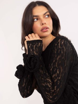 Puošni nėrinių palaidinė su dekoratyviomis gėlėmis ant rankogalių “ANDREA” juoda