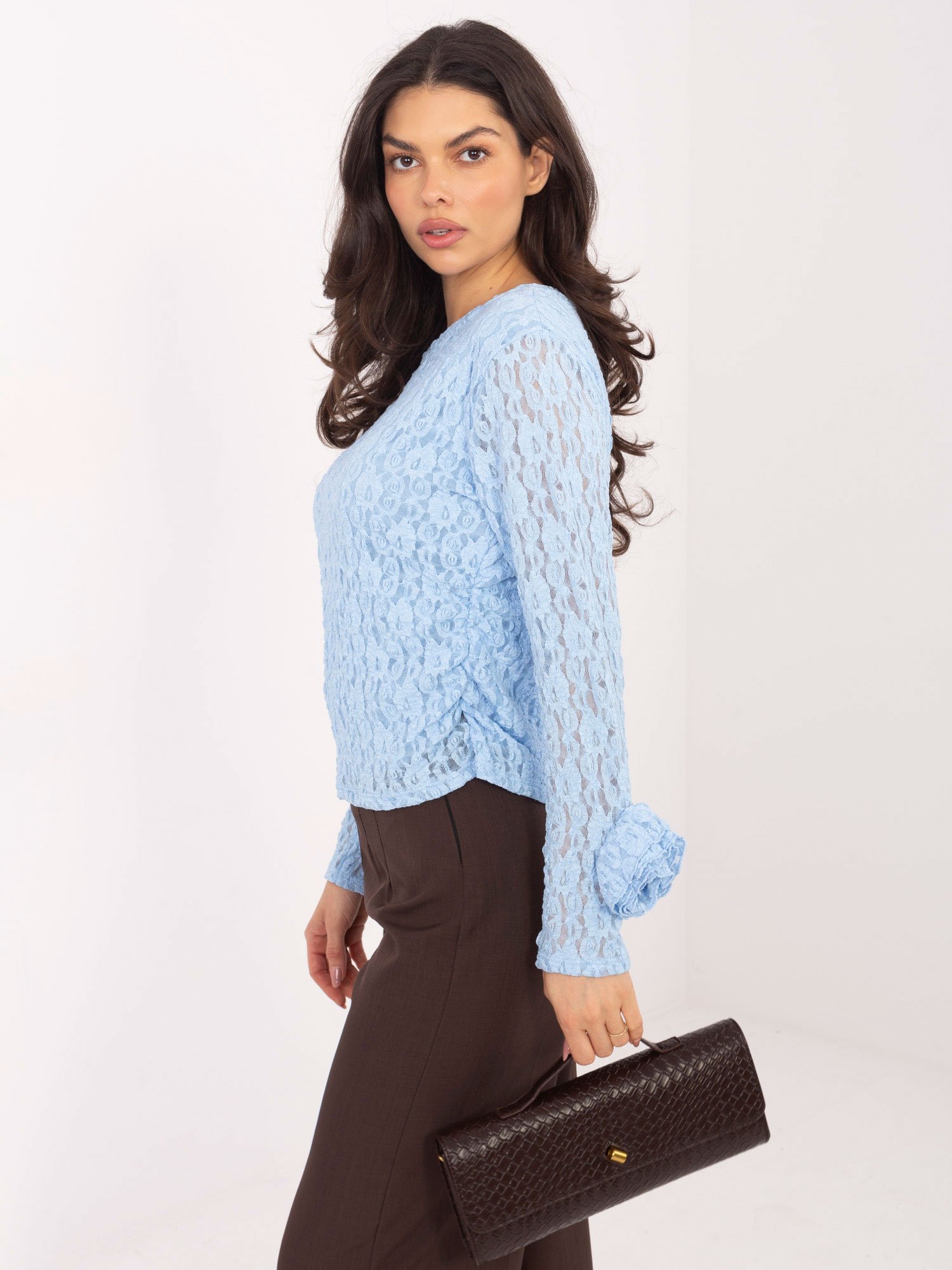 Puošni nėrinių palaidinė su dekoratyviomis gėlėmis ant rankogalių “ANDREA” šviesi mėlyna