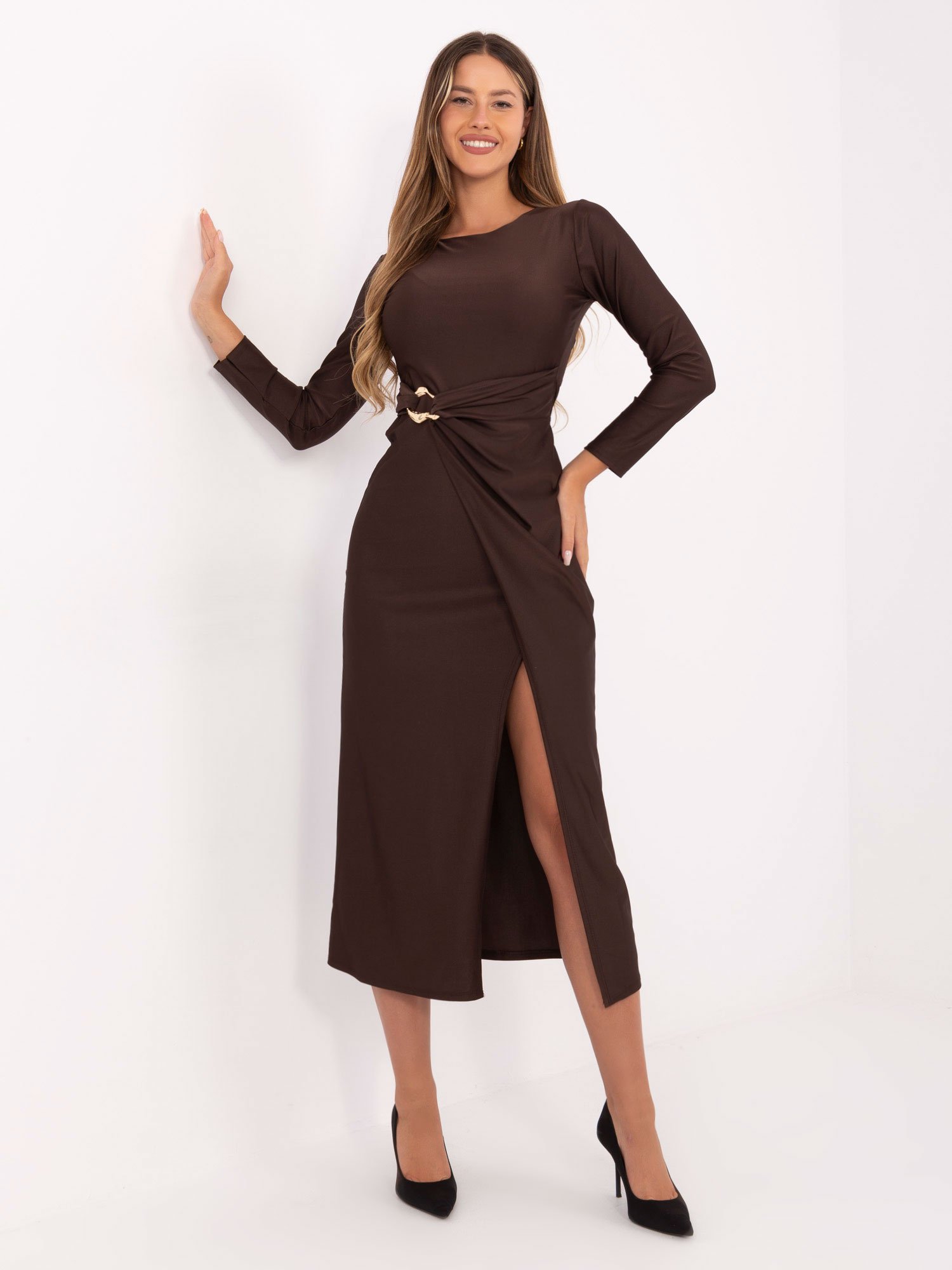 Ši elegantiška, priglundanti suknelė – tobulas pasirinkimas tiek ypatingai progai, tiek vakarienei ar šventiniam renginiui. Moteriškas siluetas, švelniai krentanti medžiaga ir subtilus skeltukas šone pabrėžia figūrą bei suteikia išskirtinio žavesio. Ilgos rankovės ir uždara viršutinė dalis suteikia klasikos bei rafinuotumo.