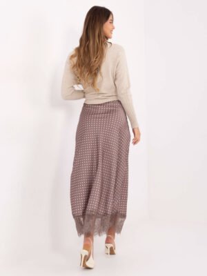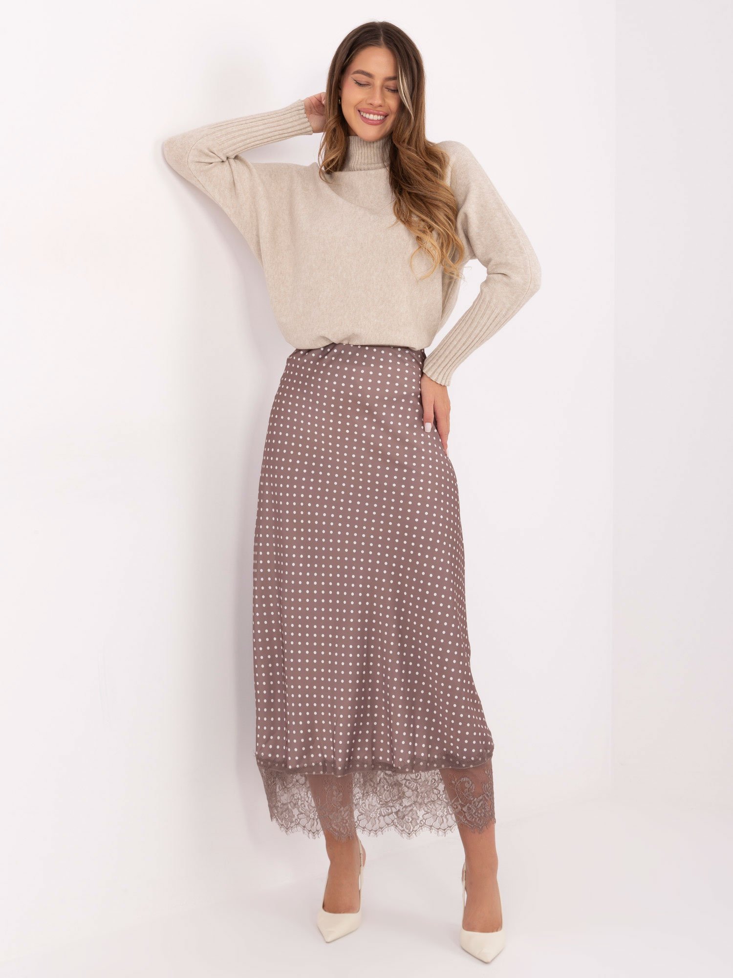 Slidaus audinio, kokybiškas, stilingas ir patogus platėjančio modelio sijonas. Audinys su taškeliais.