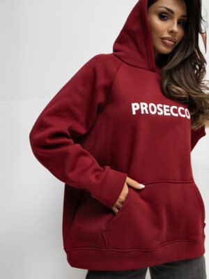 Šiltas dzemperis su kengūros kišene ir užrašu “PROSECCO” bordo