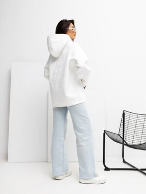 Stilingas oversize džemperis su kapišonu, kengūros kišene ir išsiuvinėtu užrašu. Šiltesnis, minkštas ir itin patogus modelis kasdienai, lengvai derinamas su tamprėmis, džinsais ar laisvo silueto kelnėmis.