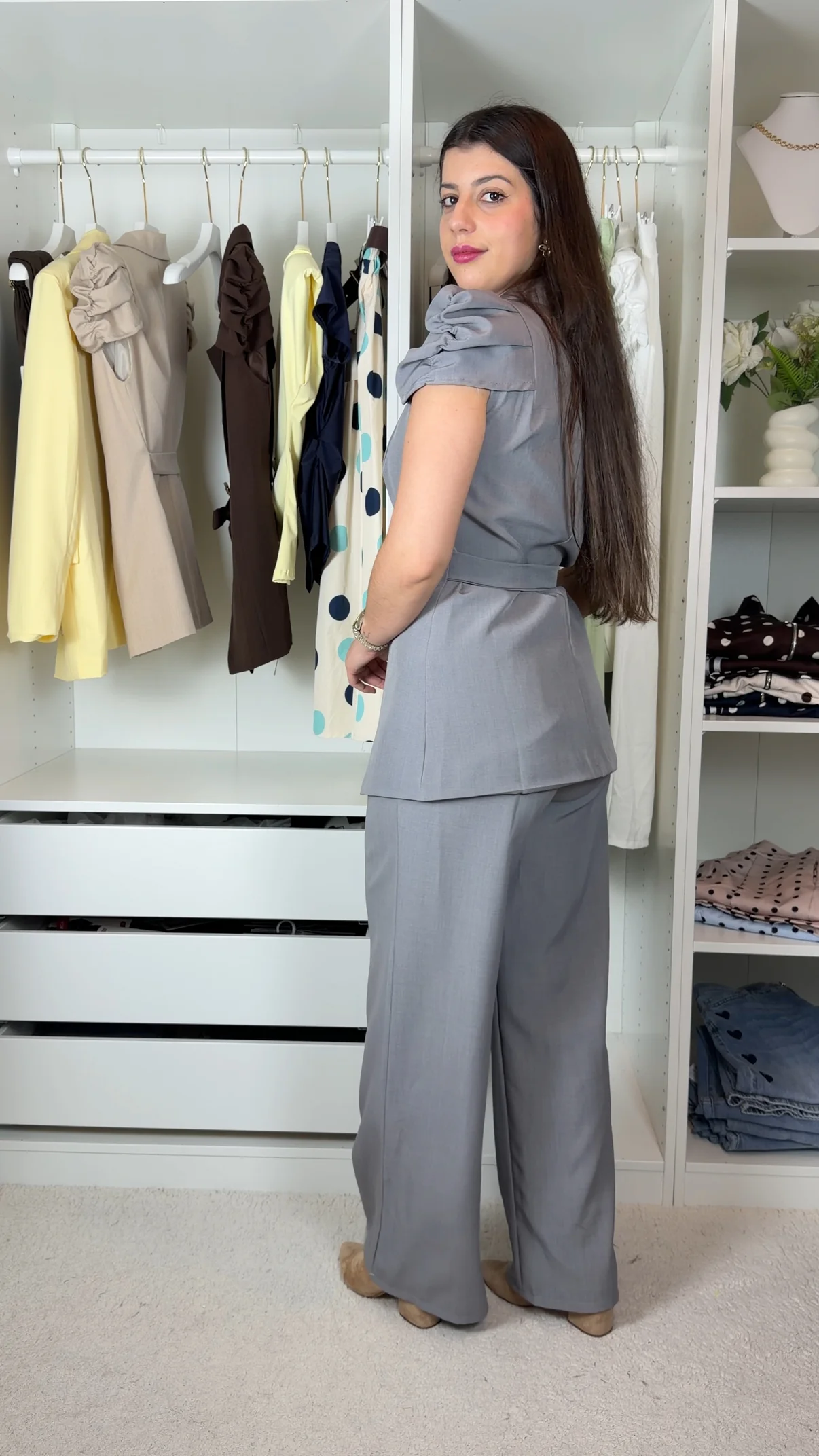 Aukštos kokybės audinio, stilingas elegantiškasa komplektas įvairiom progom. Dirželio pagalba gražiai pasireguliuoja liemens apimtis. Kelnių liemuo su tampria guma. Mažesniam dydžiui laisvesnis modelis.