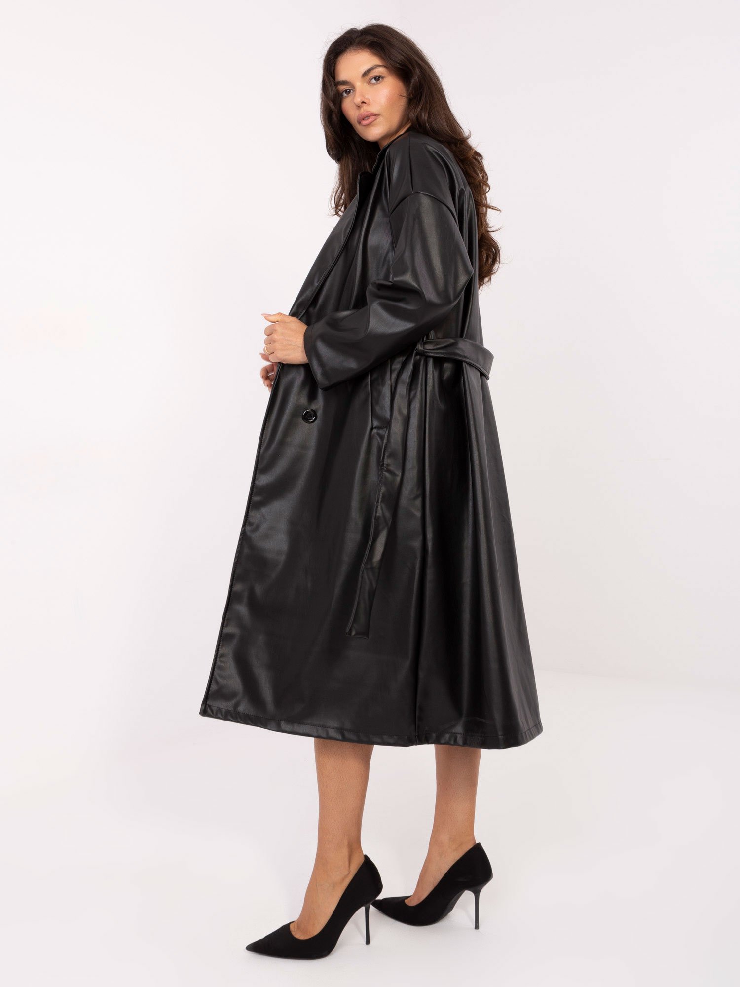 Kokybiškas, stilingas, patogus odos imitacijos OVERSIZE stiliaus paltas. Klasikinis modelis.