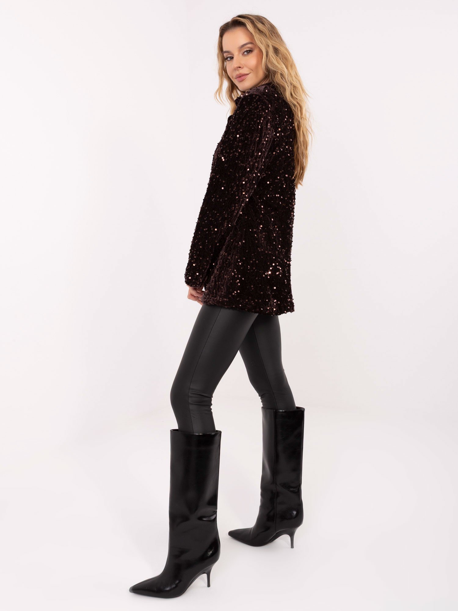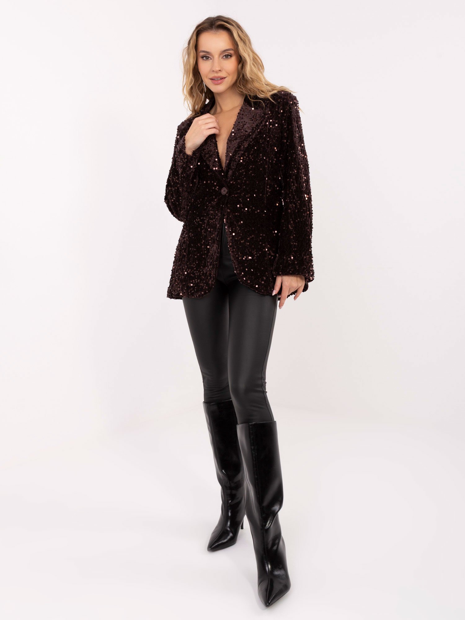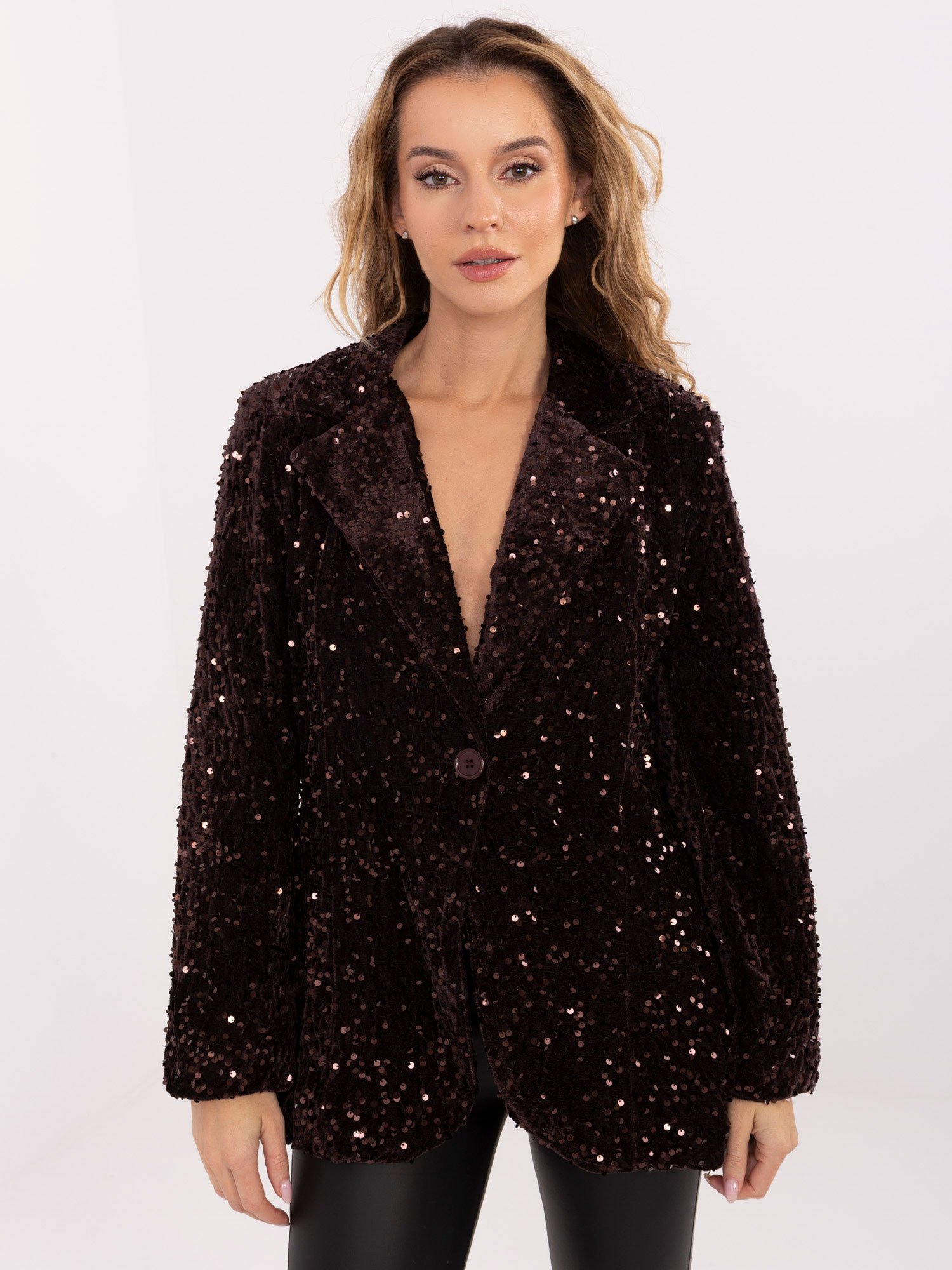 Išskirtinio dizaino moteriškas švarkas, puoštas blizgančiais žvyneliais – tobulas pasirinkimas vakarėliui ar ypatingai progai. Klasikinis siluetas derinamas su žėrinčiu audiniu, todėl šis švarkas suteikia prabangos ir išskirtinumo bet kuriam įvaizdžiui. Modelis su atviru V formos iškirpimu ir užsegimu vienu mygtuku subtiliai pabrėžia liemenį, o laisvas kritimas užtikrina komfortą ir elegantišką siluetą. Minkštas pamušalas suteikia papildomo patogumo ir leidžia švarkui išlaikyti formą. Puikiai tinka tiek prie klasikinių kelnių, tiek prie sijono ar odos imitacijos kelnių.