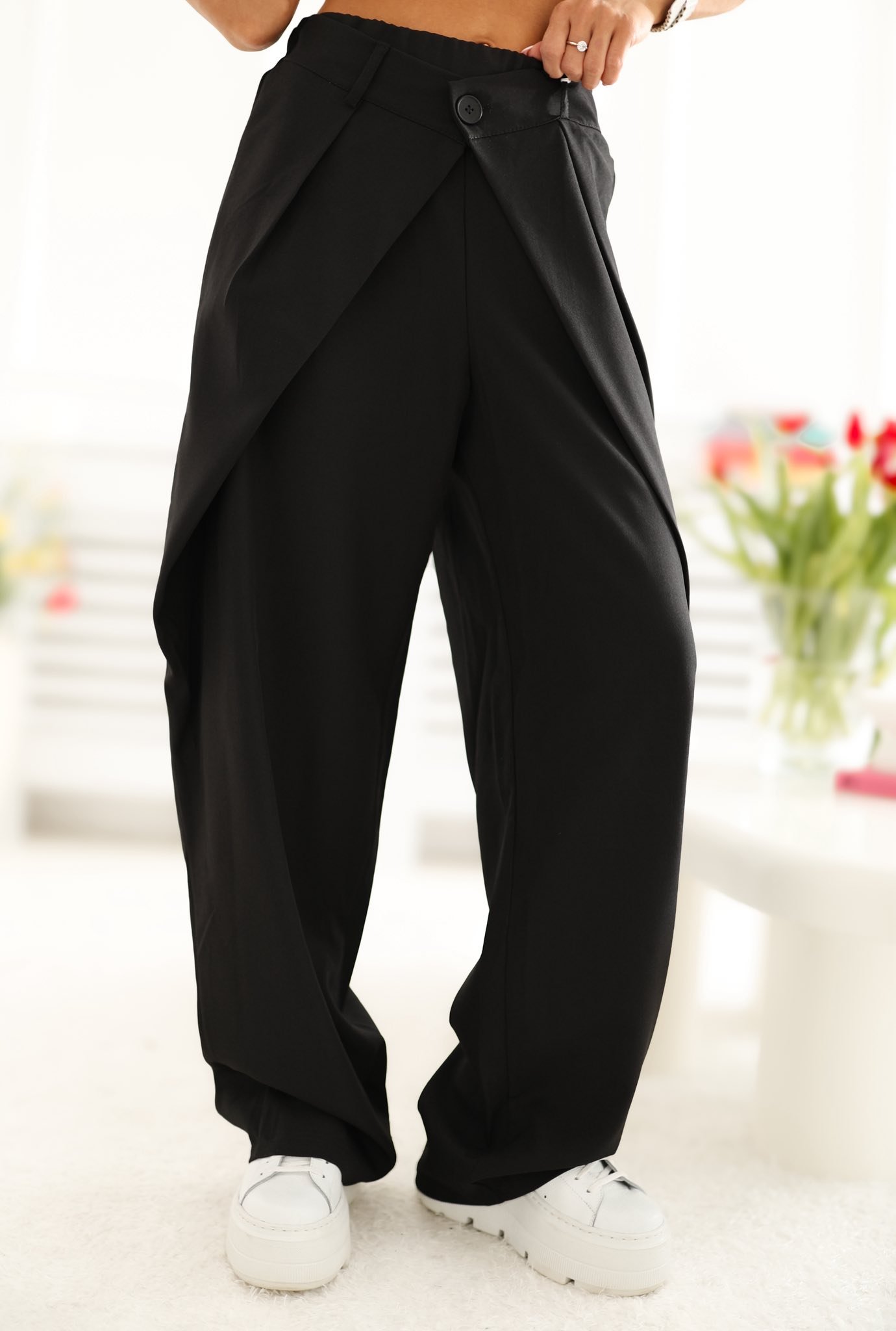 Modelis dėvi VIENO DYDŽIO kelnes