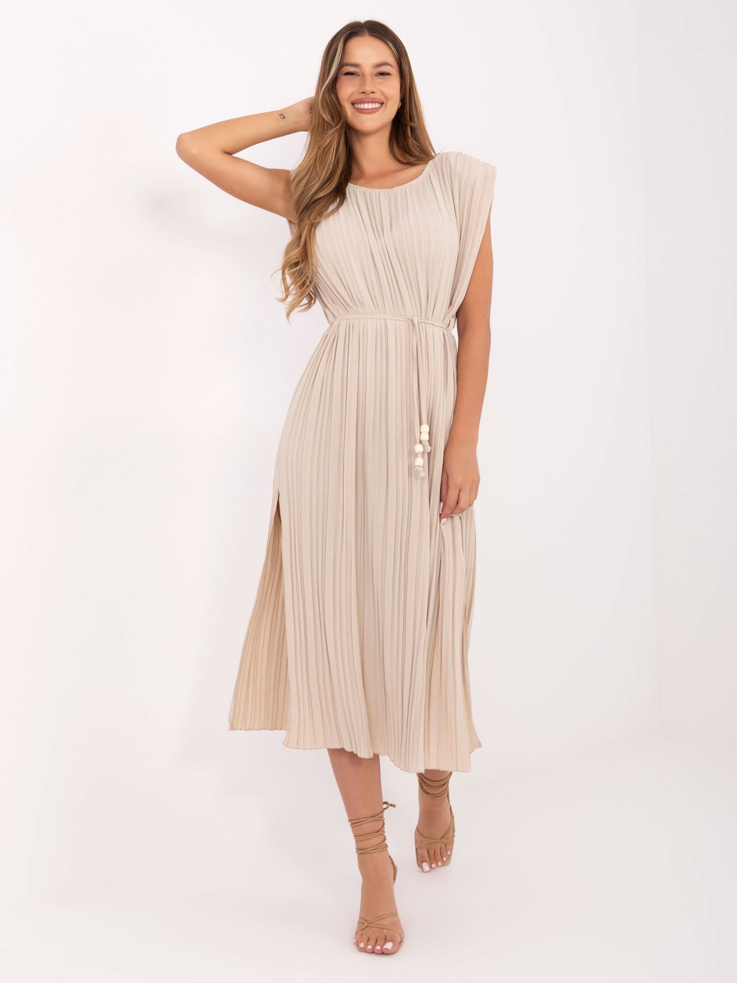 Modelis dėvi vieno dydžio drabužius. Modelio išmatavimai: ūgis 176 cm, krūtinė 90 cm, liemuo 62 cm, klubai 94 cm.
