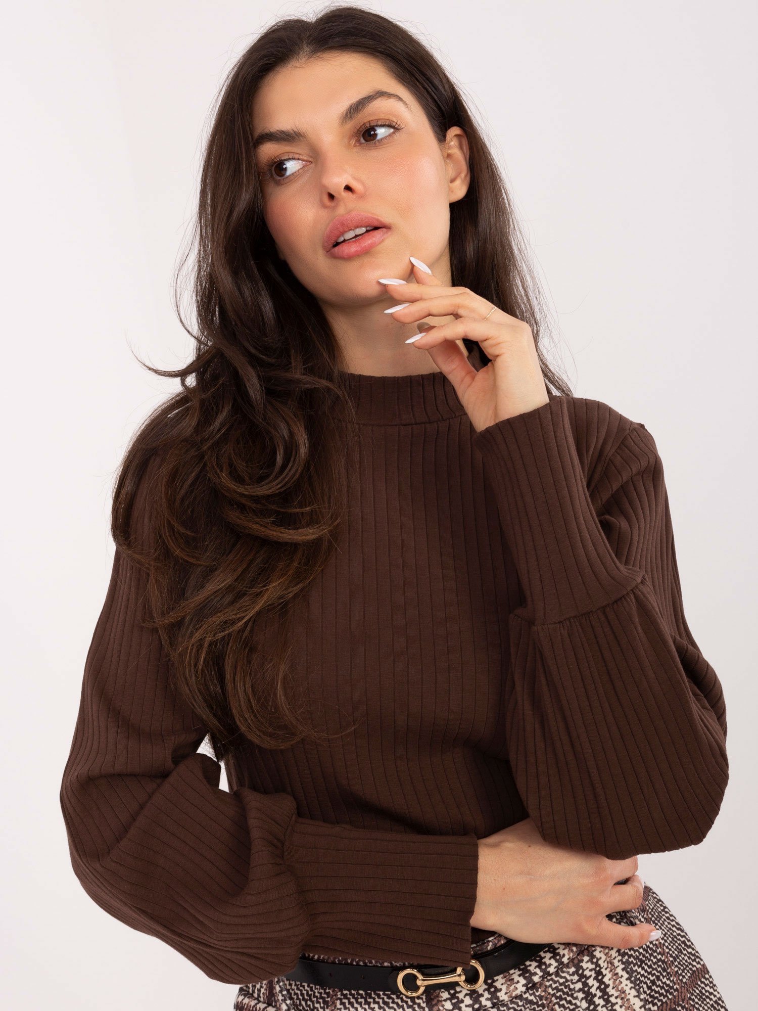 Modelis dėvi S/M dydžio palaidine aukštu kaklu.