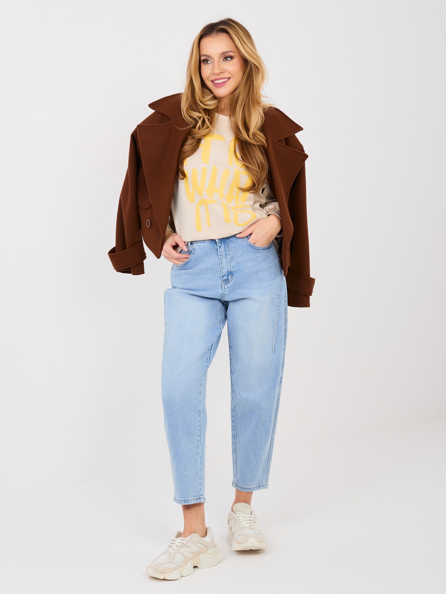 Urban stiliaus oversize džemperis su užrašu ” WHAT IT IS” smėlio