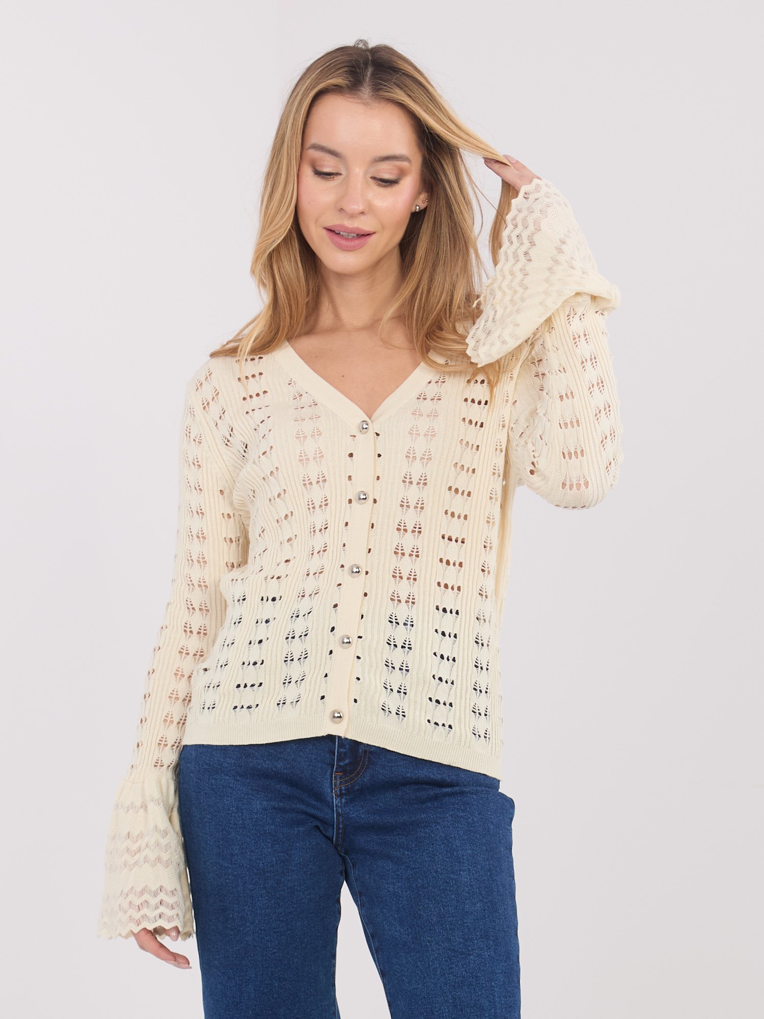 Užsegamas nėrinių megztukas su varpelio formos rankogaliais “NELLY” šviesi smėlio