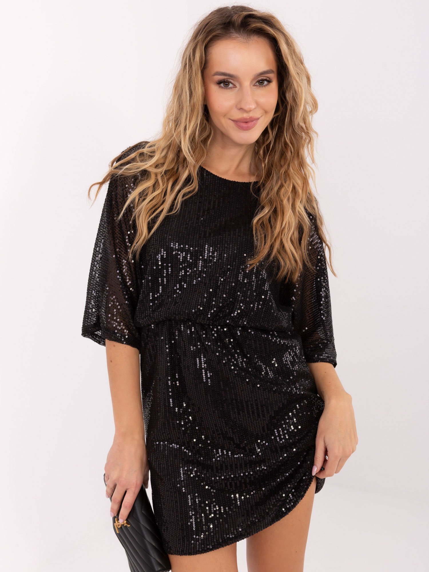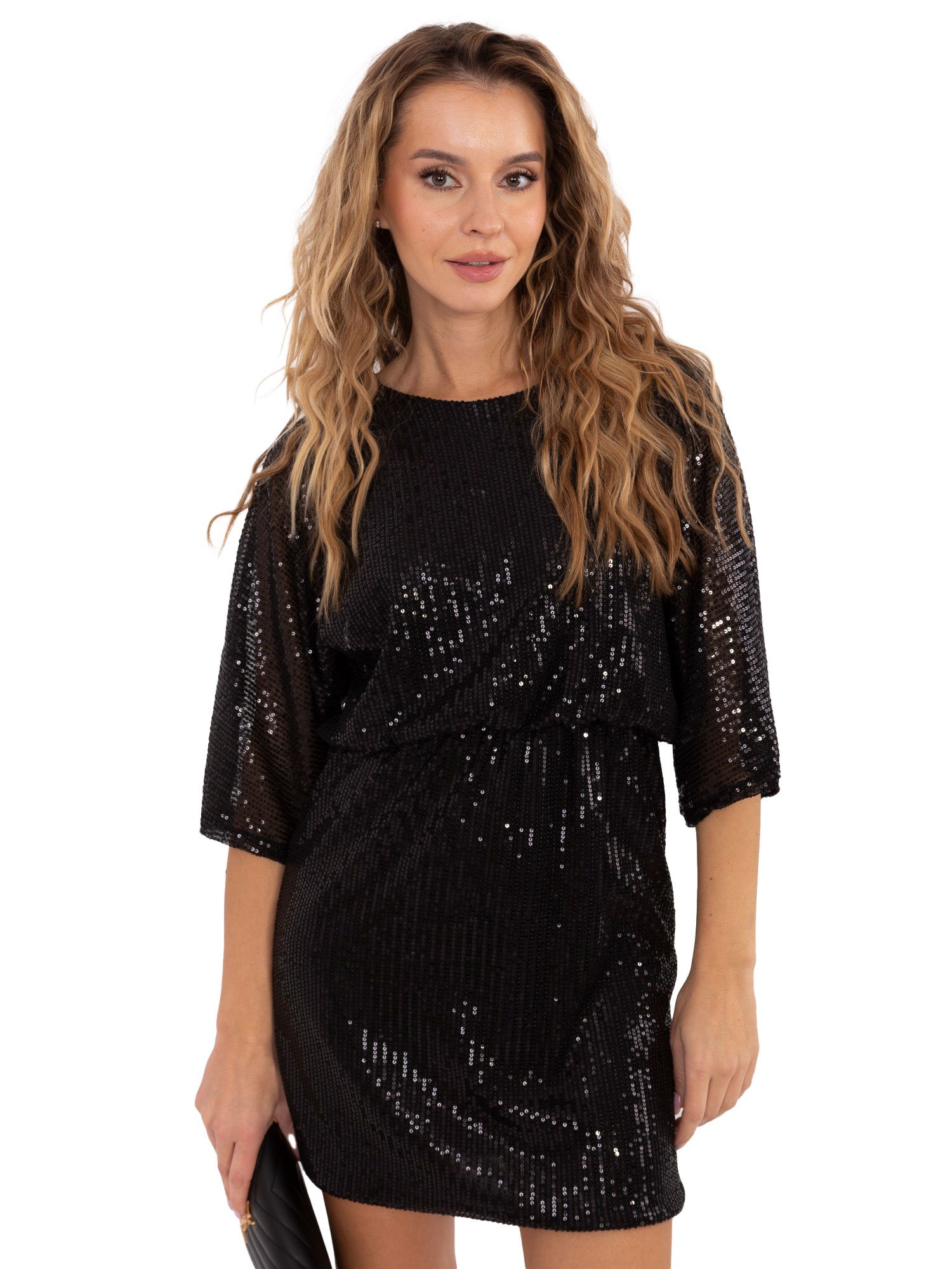 Stilinga blizgi mini suknelė suteikia įvaizdžiui spindesio ir elegancijos. Laisvo kirpimo modelis su platėjančiomis, kimono tipo rankovėmis ir tampriu juosmeniu pabrėžia figūrą bei užtikrina patogumą. Suknelė puikiai tinka vakarėliams, šventėms ar ypatingoms progoms – kai norisi suspindėti.